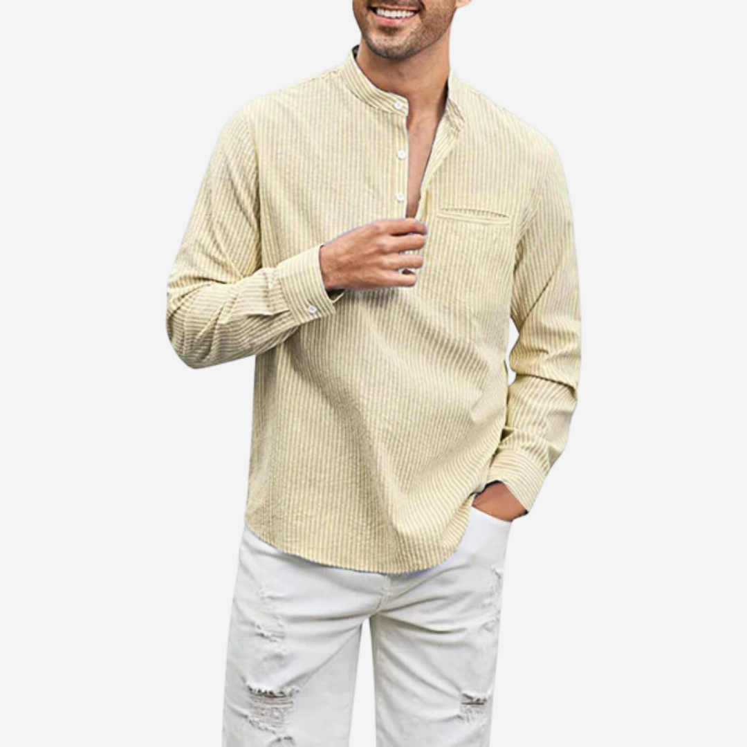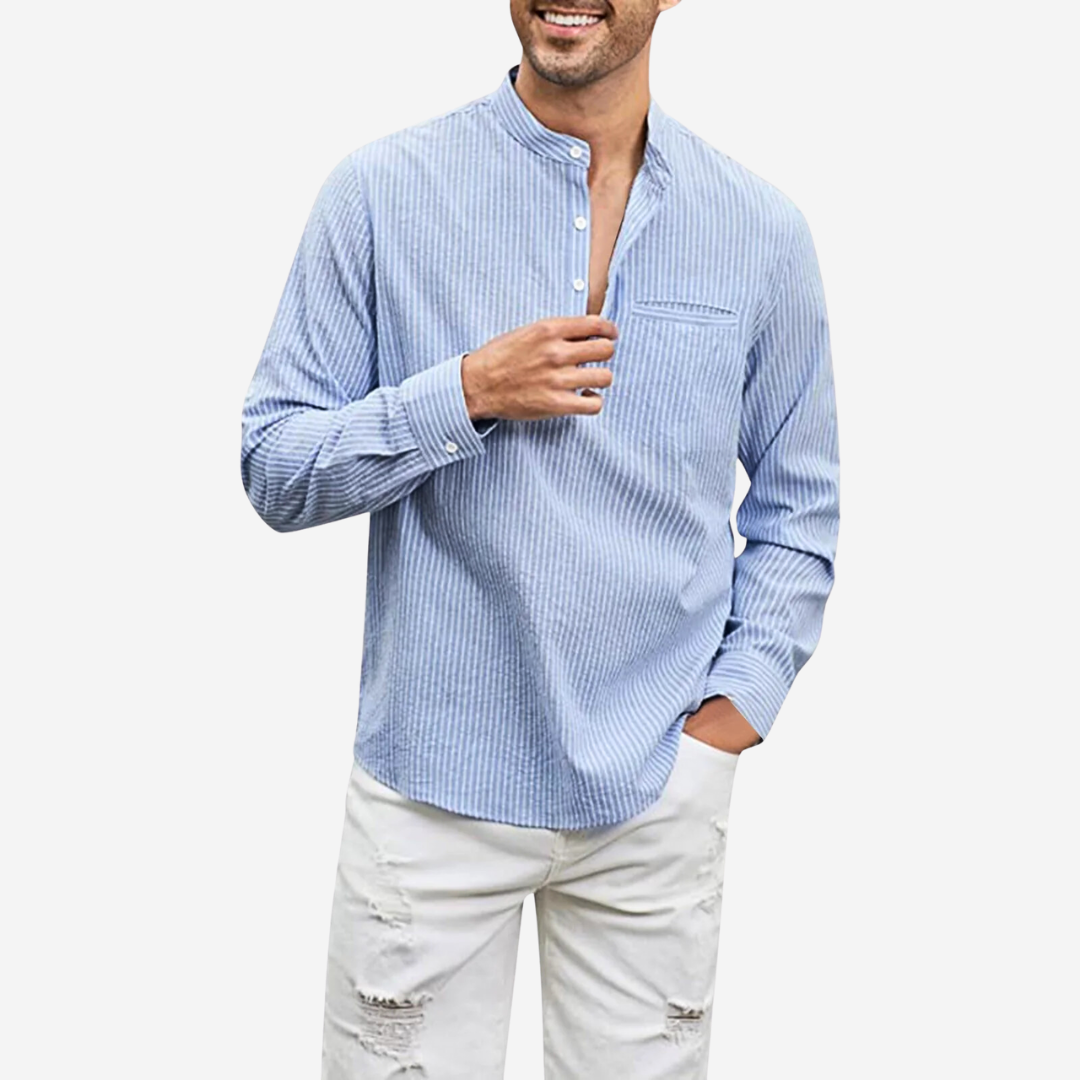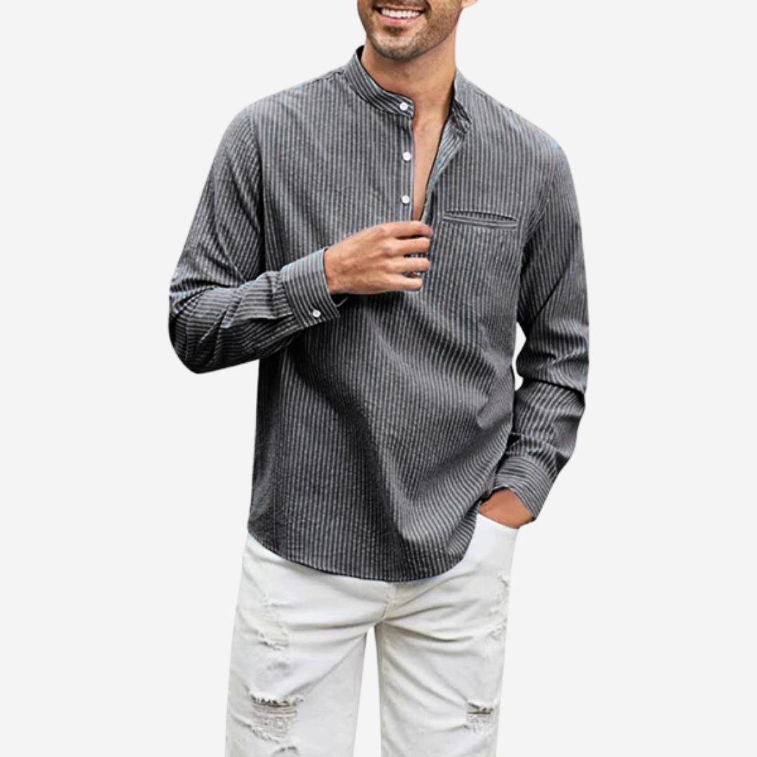 Introducing the Tom Carter Striped Formal Shirt – a contemporary twist on the classic men's long sleeve Henley shirt. This stylish wardrobe staple combines the sophistication of a dress shirt with the comfort and versatility of a Henley, making it perfect for both work and social occasions.