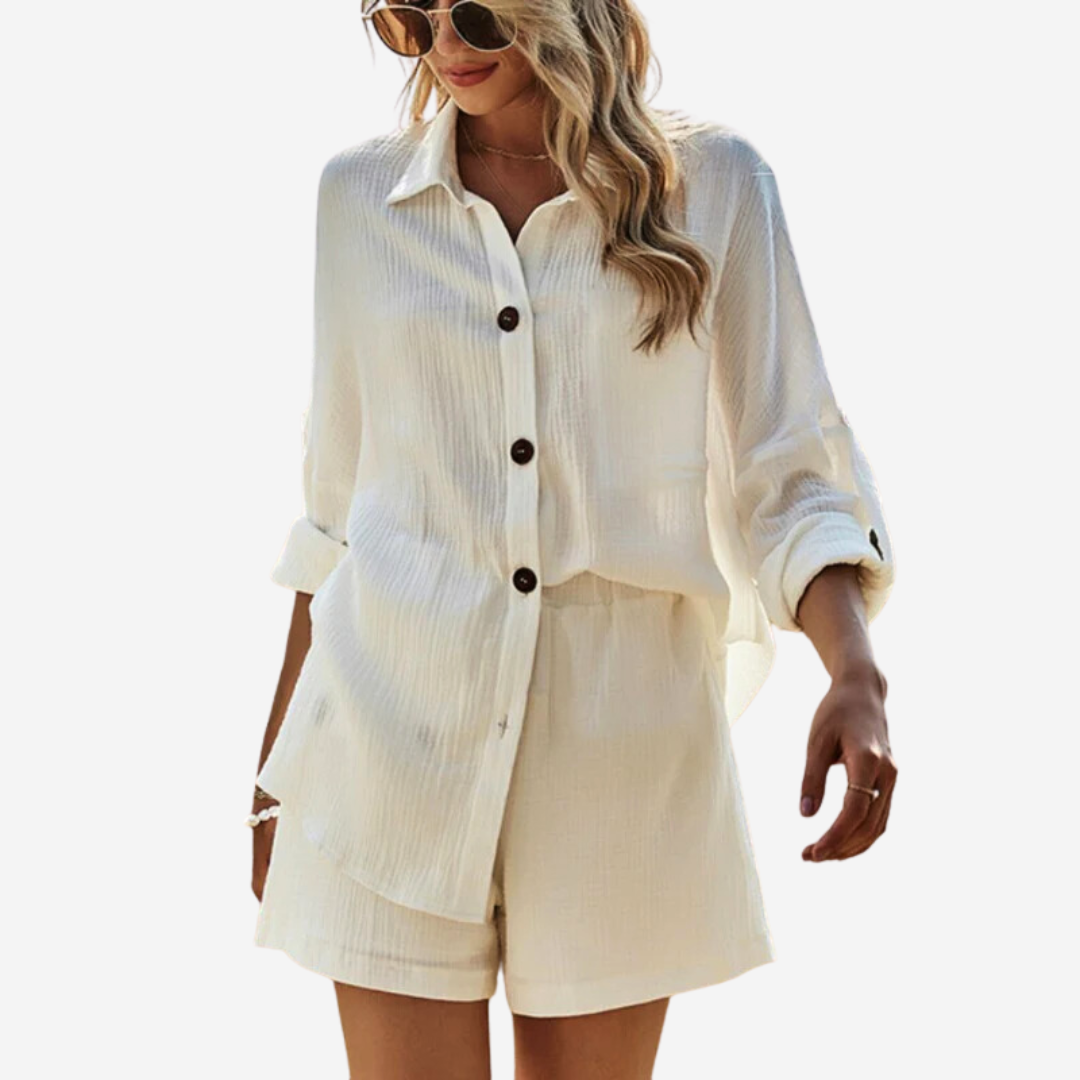Introducing the Olivia Sinclair Breeze Set, a stylish and comfortable women's button-up shirt and short set crafted from 100% breathable cotton. This versatile ensemble, perfect for casual outings or a relaxed day at home, features a timeless design with a modern twist.