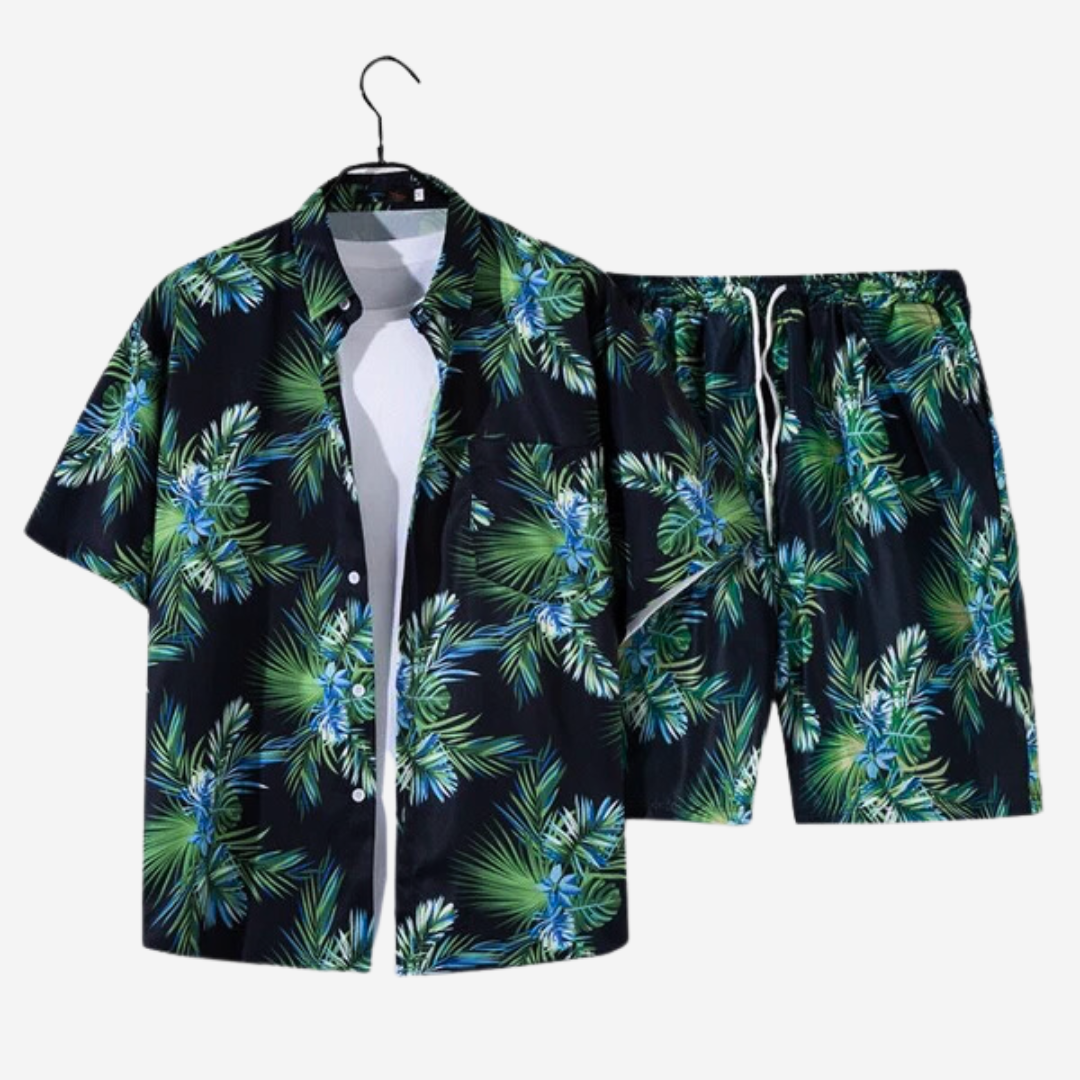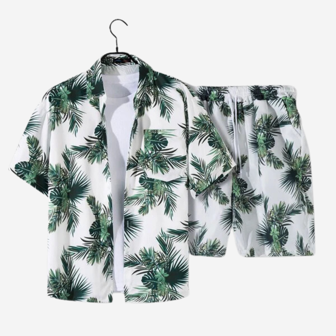 The Tom Carter Verdure Essence Set is a stylish and comfortable men's buttoned tee and shorts ensemble, perfect for casual or beach outings. Adorned with a playful palm tree design, it exudes a relaxed, tropical vibe that effortlessly captures the spirit of summer.