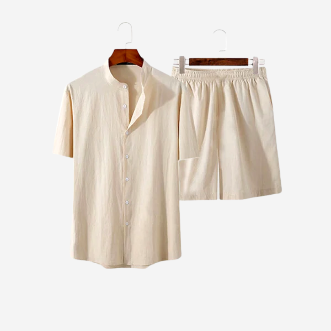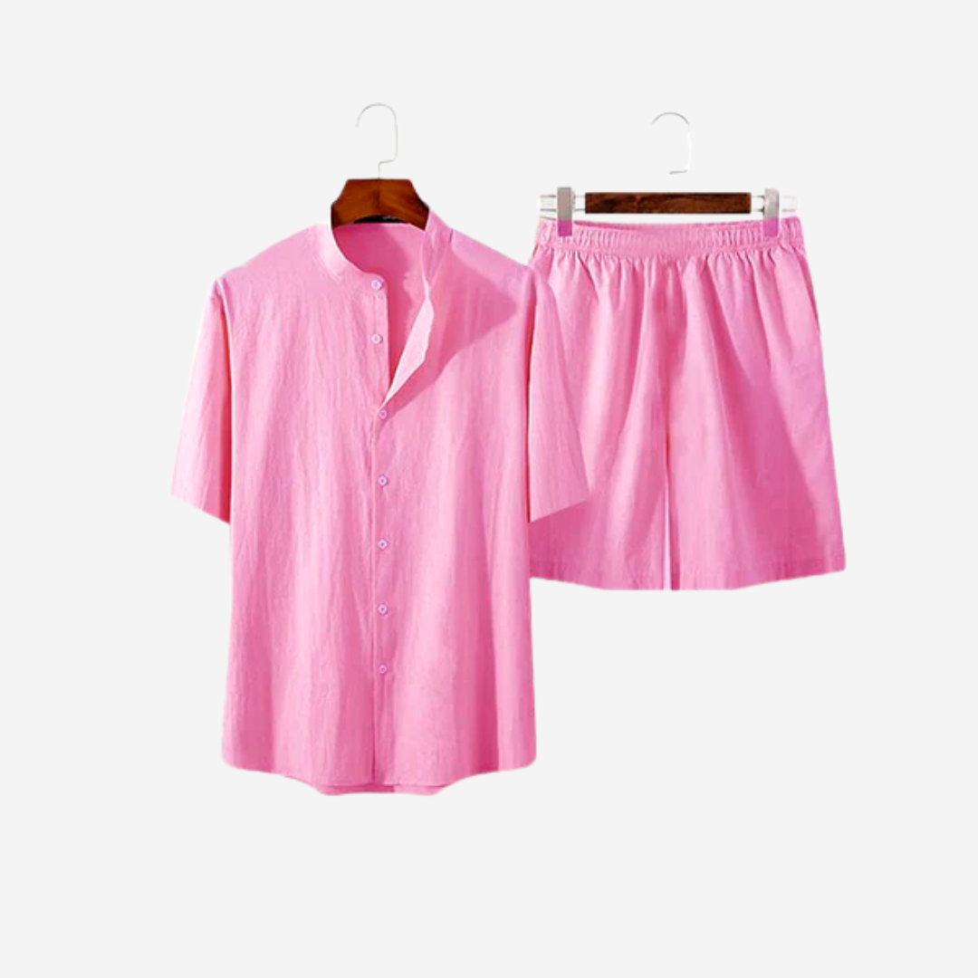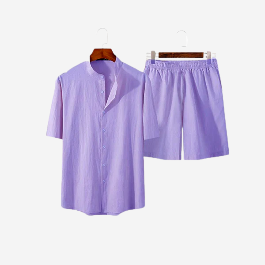 - includes a short sleeved shirt and shorts, both made from breathable cotton blend fabric