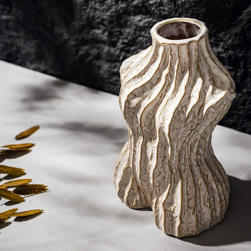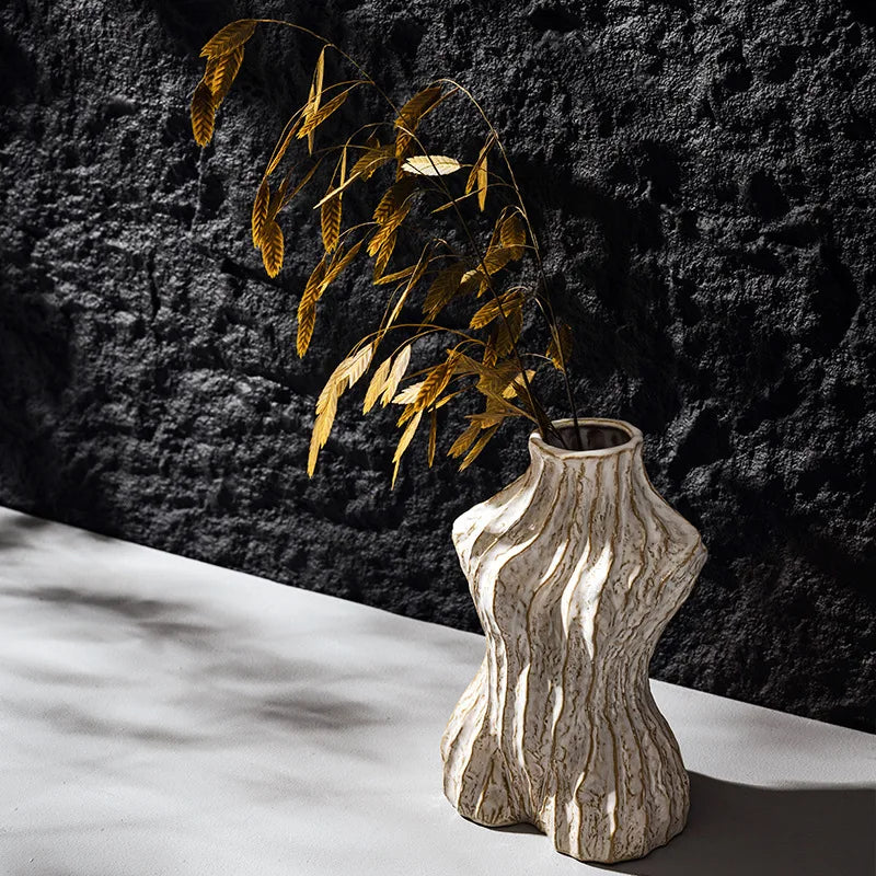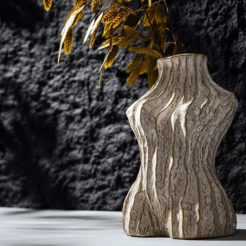 This striking vase is a modern art piece inspired by the female form. Its textured surface and graceful curves evoke the beauty of nature while its metallic finish adds a contemporary touch. Perfect for displaying flowers or simply as a standalone sculpture, this vase is a captivating addition to any interior.