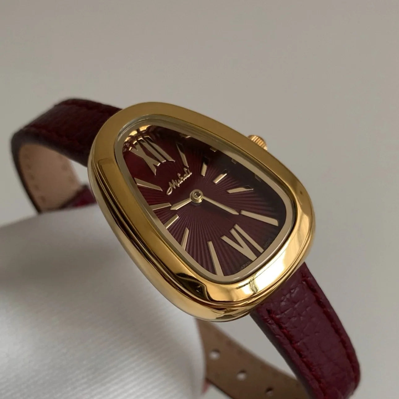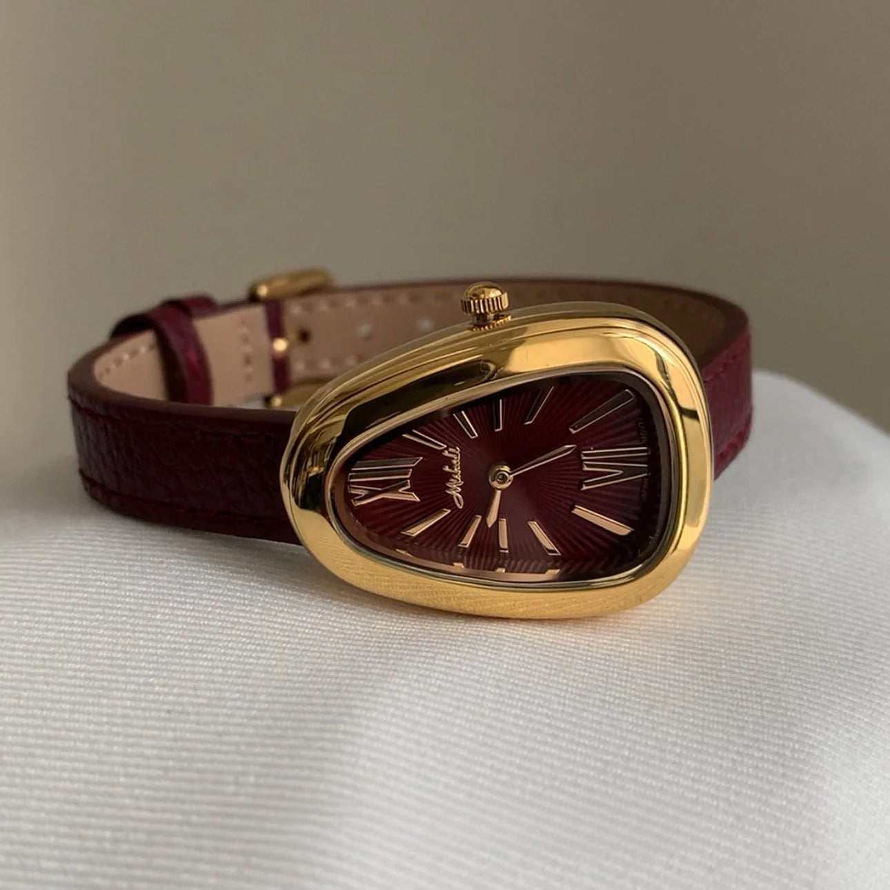 The fluid serpentine silhouette frames a dial accented with bold Roman numerals, while the genuine leather strap ensures enduring comfort. Designed for the discerning eye, this watch exudes quiet luxury at every turn.