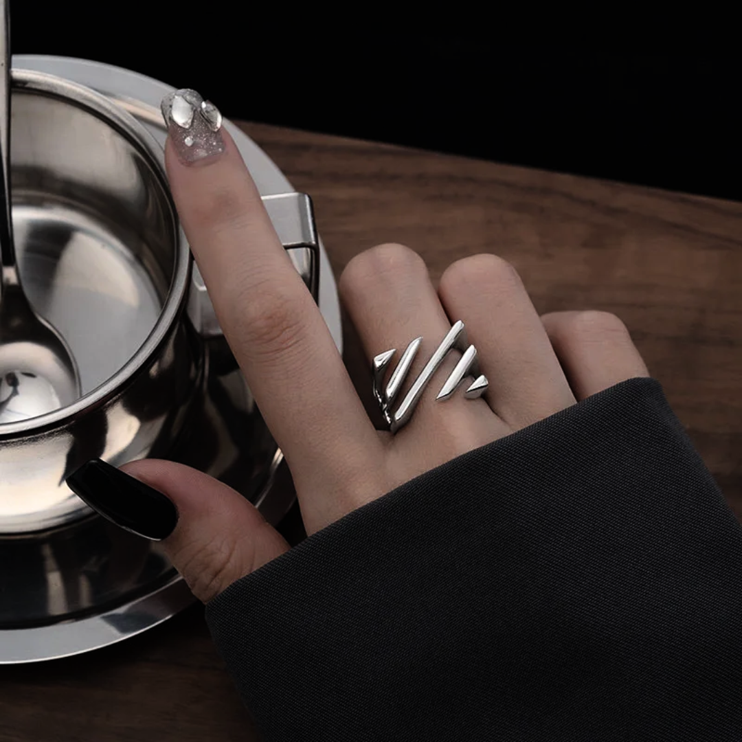 This minimalist masterpiece features a constellation of slender, silver-toned bars that curve gently around your finger. The open, airy design is both modern and timeless, capturing the essence of architectural elegance.