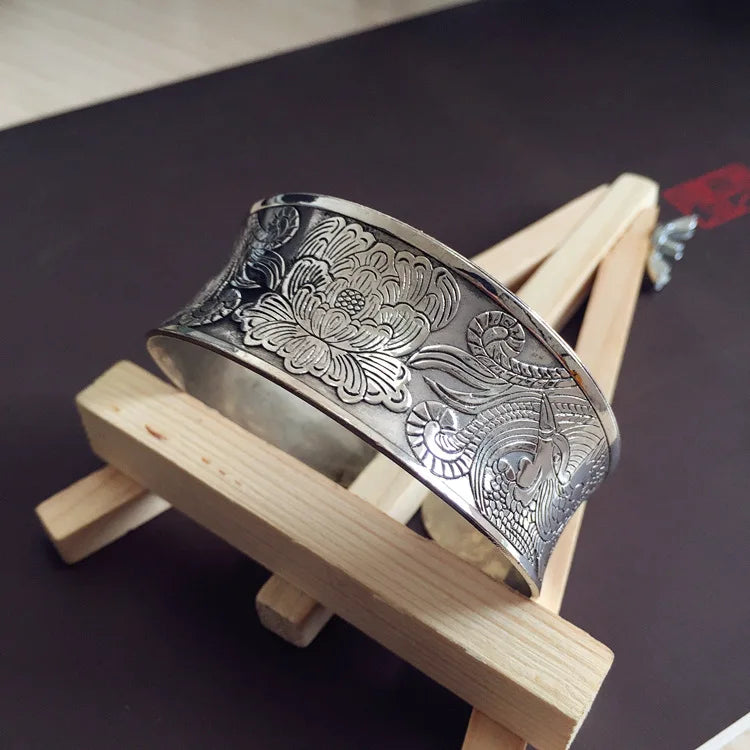 Cast in solid oxidised silver, this wide, open‑back cuff is deep‑engraved with interlocking peonies and cloud scrolls, then hand‑burnished to let highlights bloom against its moody patina. The gently tapered edges slip on with silk‑glove ease, giving every wrist shot an instant heirloom aura.