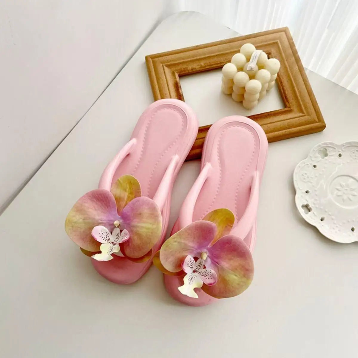 Each pair blooms with a lavish orchid centerpiece that exudes tropical sophistication. Plush footbeds cradle your every step, while discreet grip soles keep you poised—whether you’re strolling along the shore or gliding through brunch dates in the city.