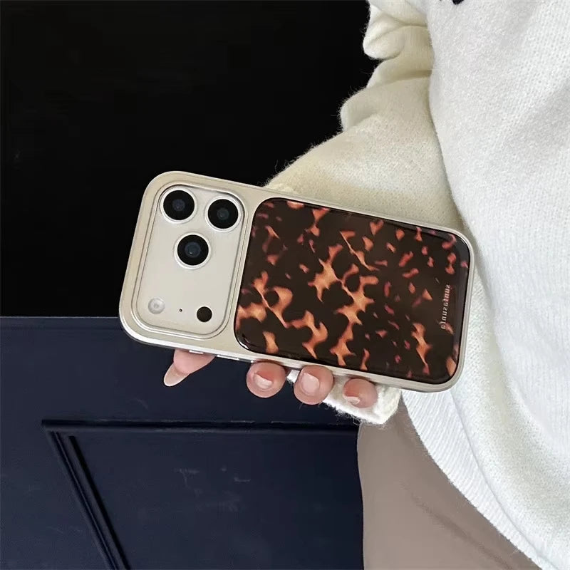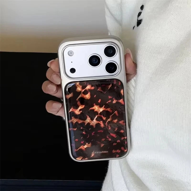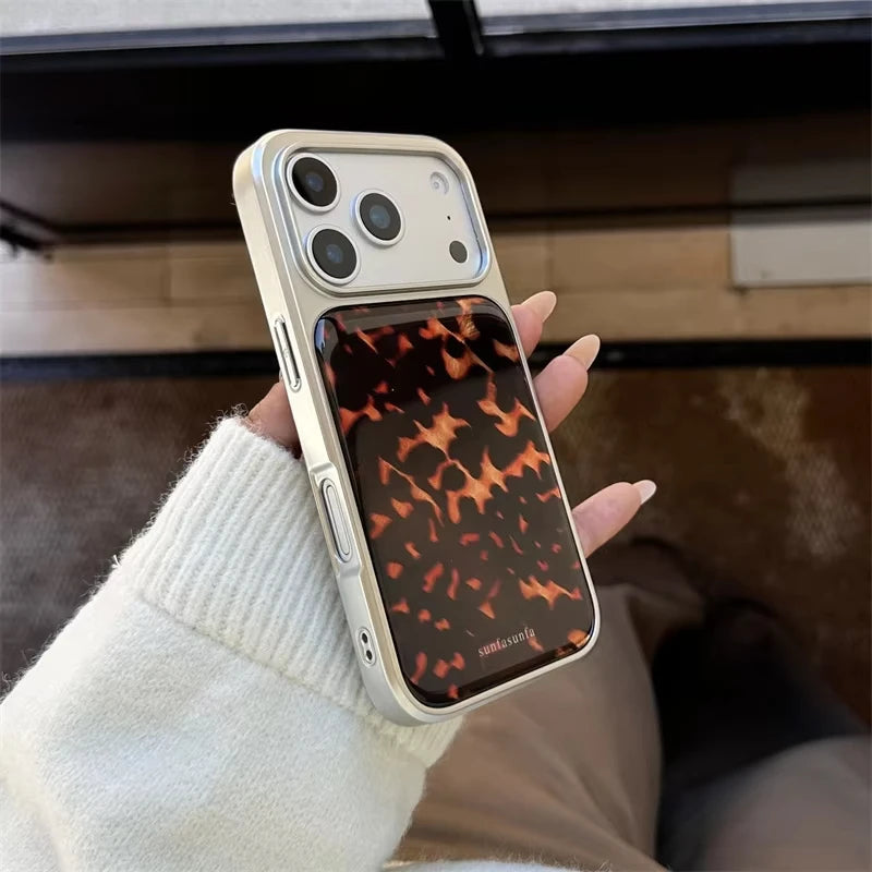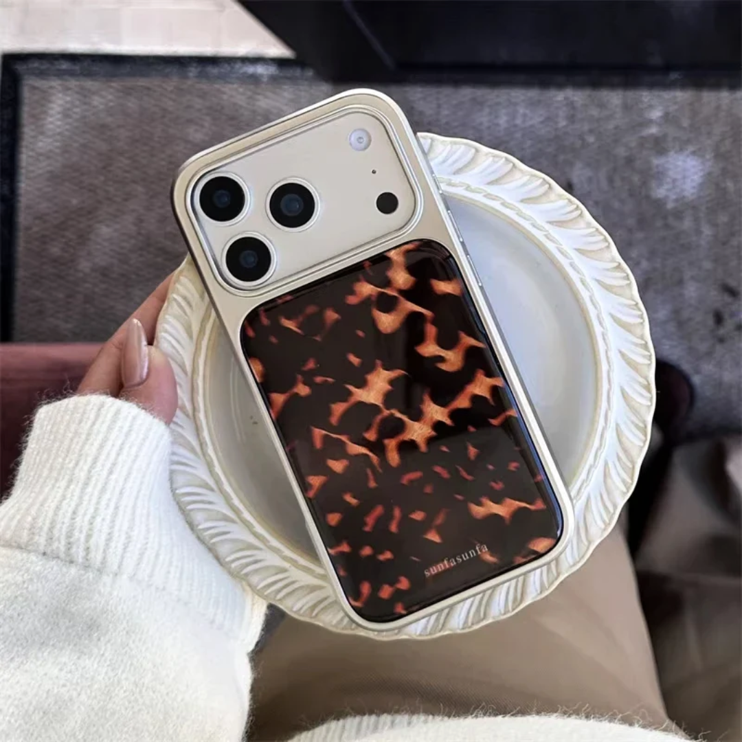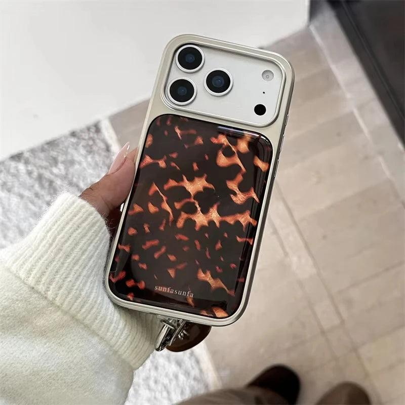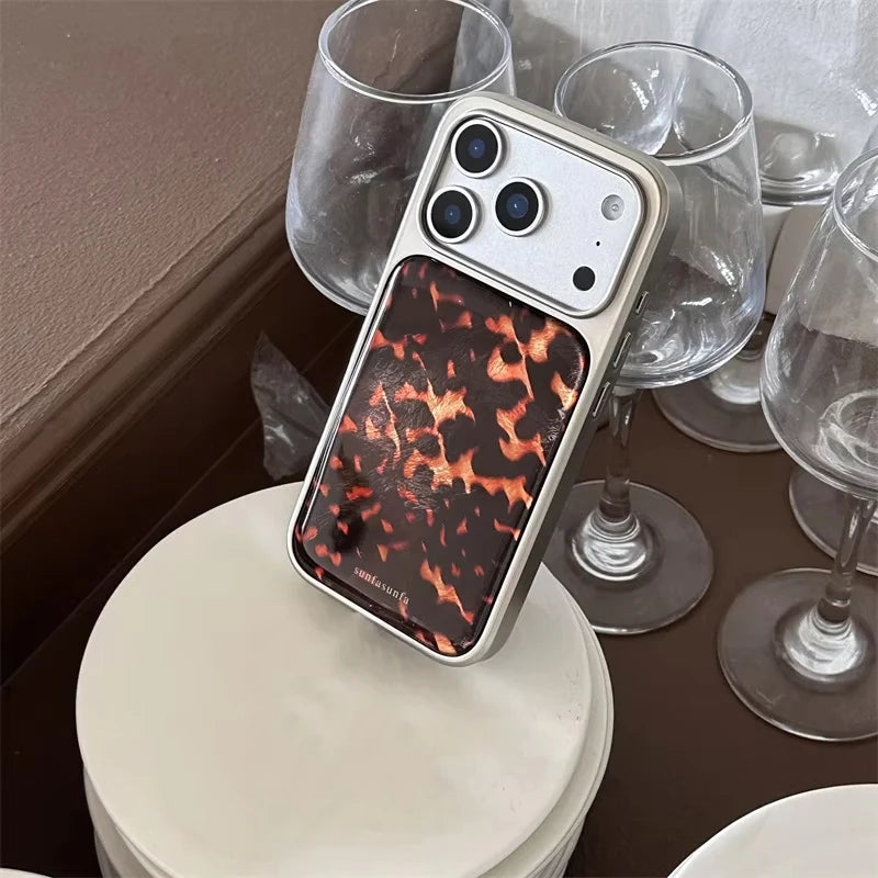 Phone case with amber tortoiseshell-style leopard panel and glossy finish. Hard back design with electroplated edge frame.