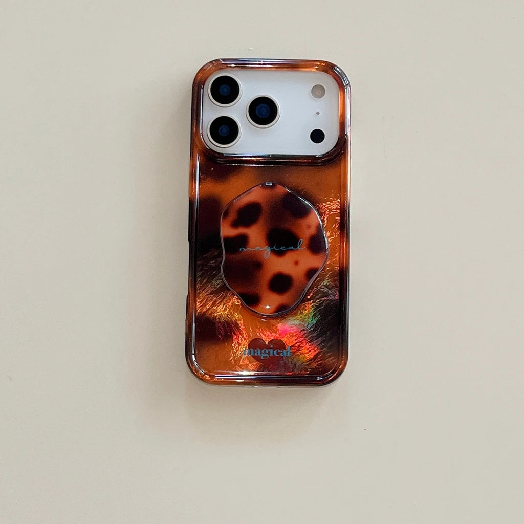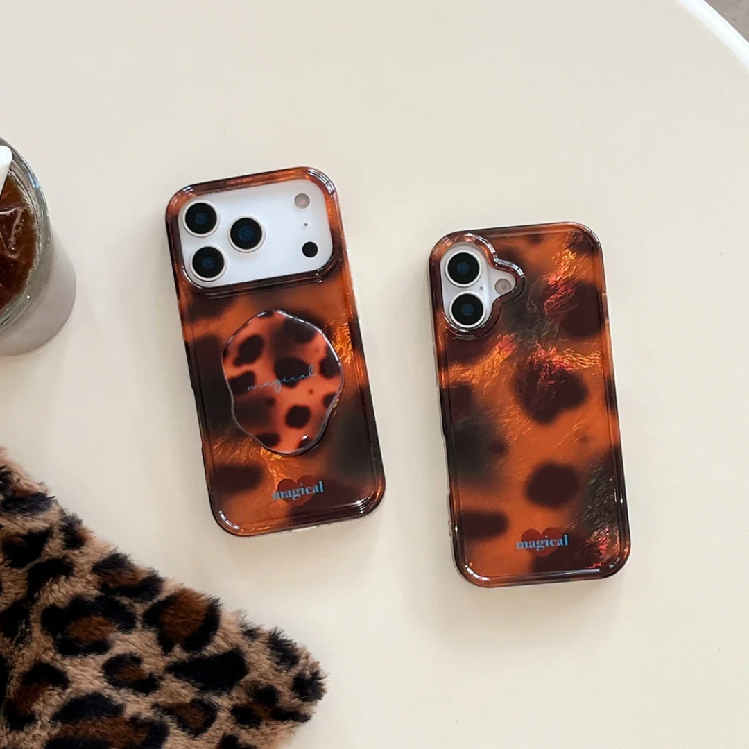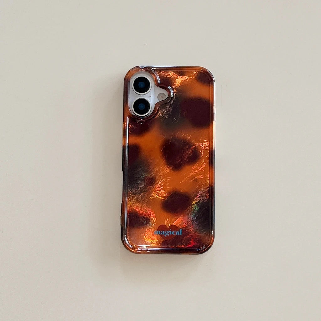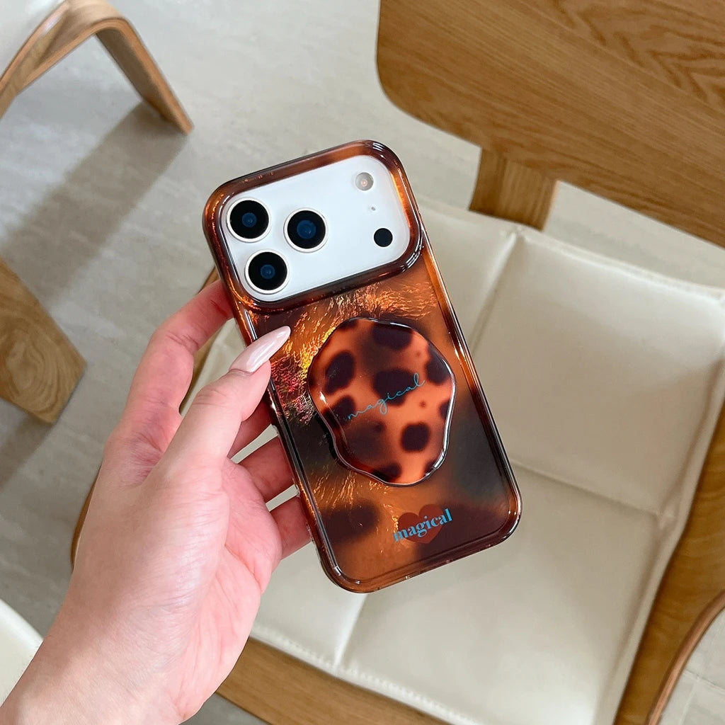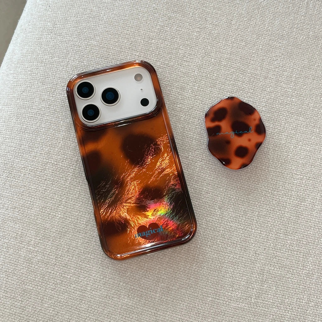 A molten amber pattern ripples across a glossy resin-like back, creating a warm, vintage-inspired finish that feels both modern and retro. The slim case includes a matching pop-holder, keeping your phone secure while adding a unique, high-gloss texture for mirror selfies.