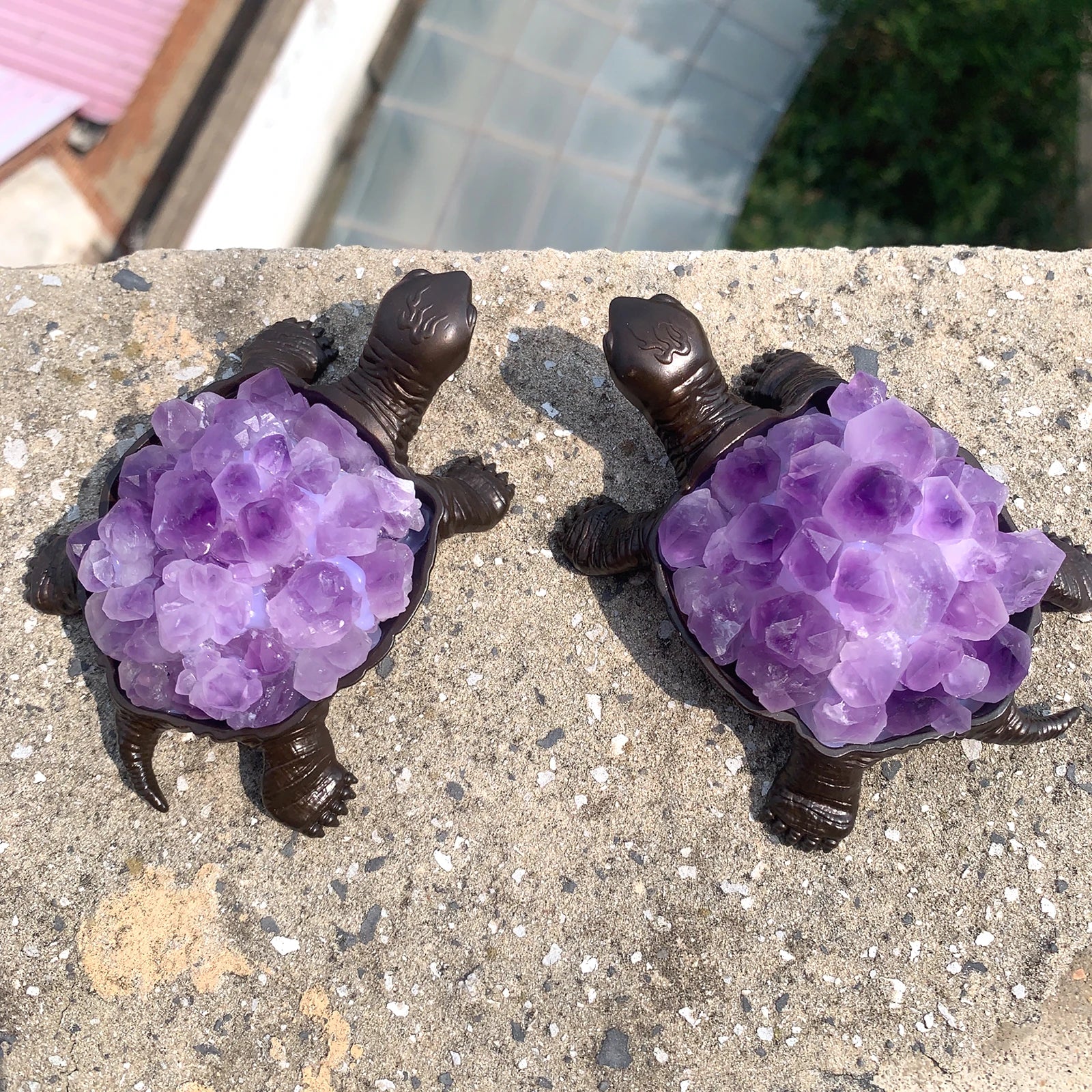 Imagine a little nook in your home, a corner where calm reigns and beauty blooms—a place where our Amethyst Turtle Treasures reside. Each of these charming figurines captures a moment of magic: a turtle, symbol of wisdom and endurance, emerges, its shell a radiant cluster of amethyst crystals sparkling with ancient secrets.