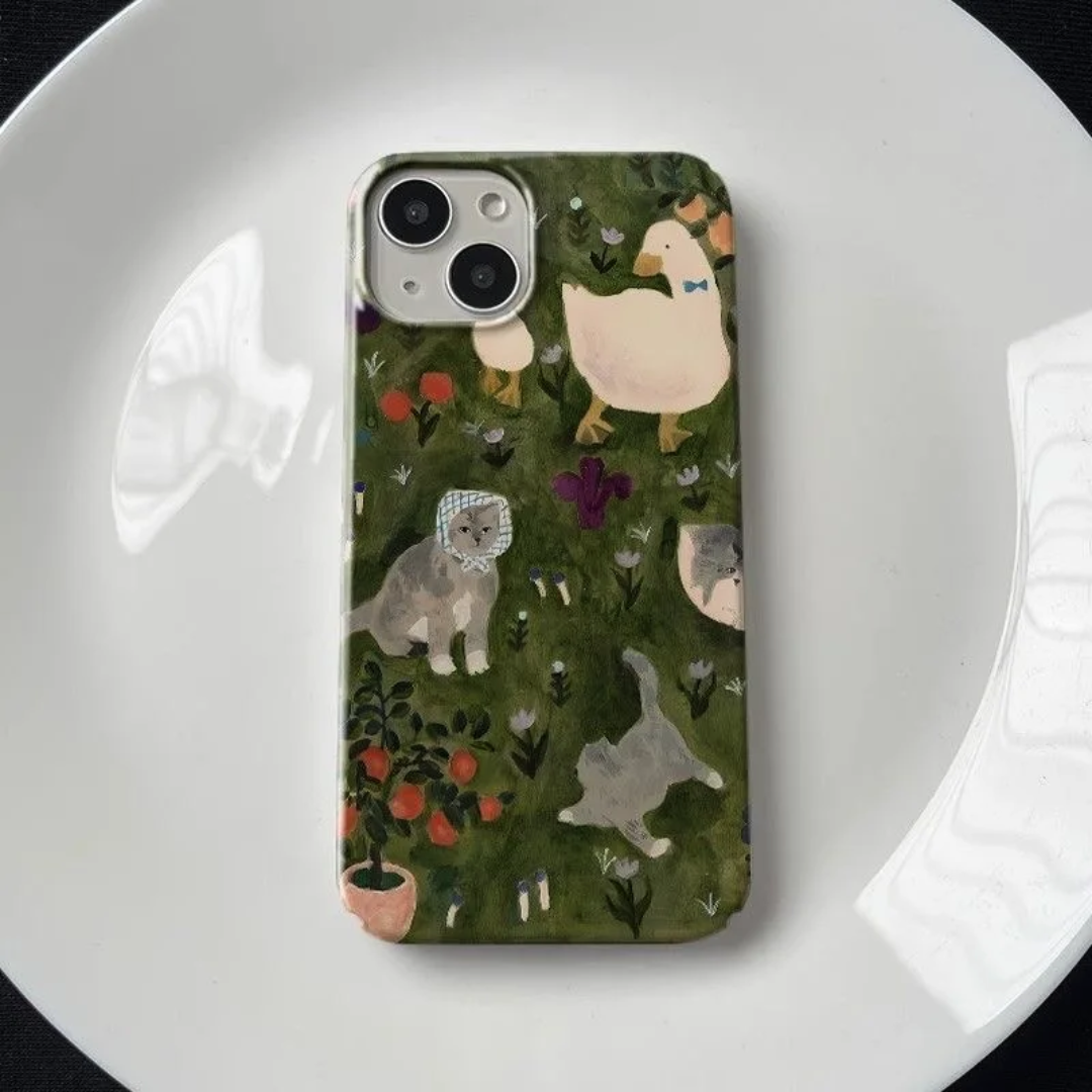 A soft green “garden” scene covers this case with little pets, plants, and fruit, like a tiny storybook painted on the back of your phone. The print is slightly textured and sealed under a protective layer, so the artwork stays bright while your phone stays safe.