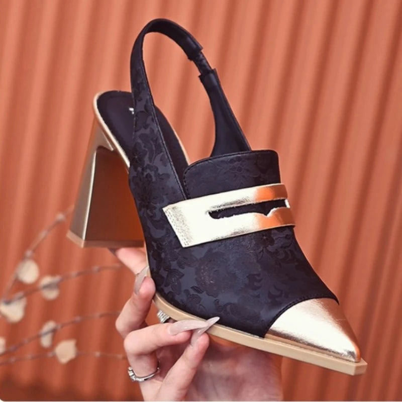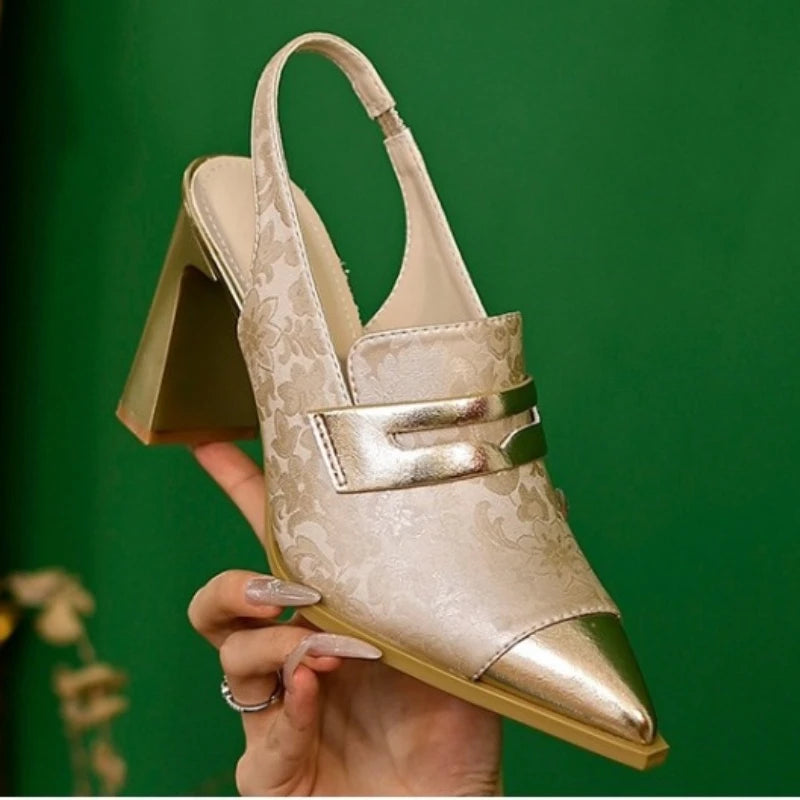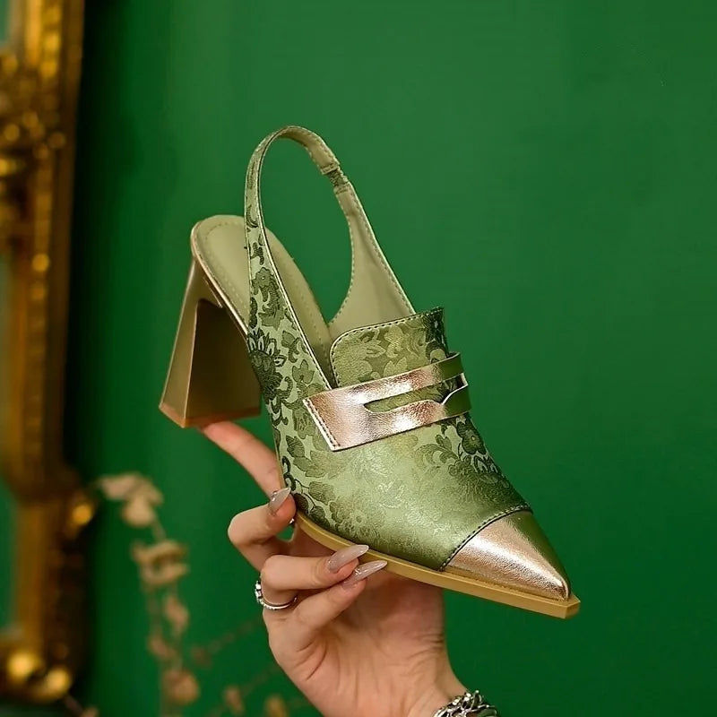 Each pair is meticulously crafted, featuring a bold block heel, a pointed toe for a touch of allure, and a supportive slingback strap that exudes confidence. Choose from an array of vibrant greens and opulent golds, each rendered in sumptuous Italian leather or eye-catching metallic accents.