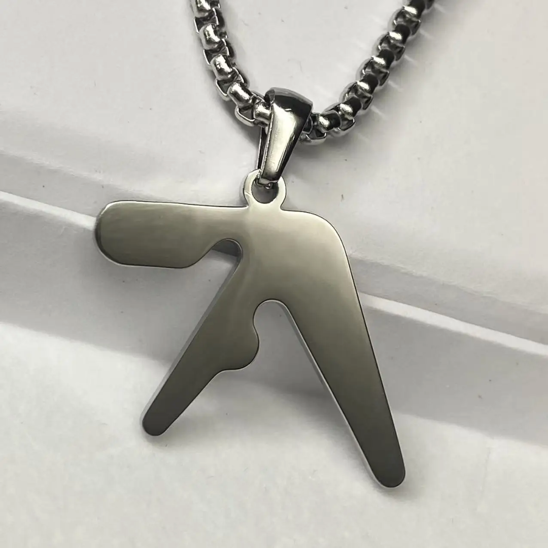 A clean, high‑polish steel pendant in the iconic Aphex‑style symbol hangs from a chunky curb chain for a bold, music‑scene look. It sits flat on the chest, catching light without feeling heavy, so you can wear it with hoodies, tees, or night‑out fits.