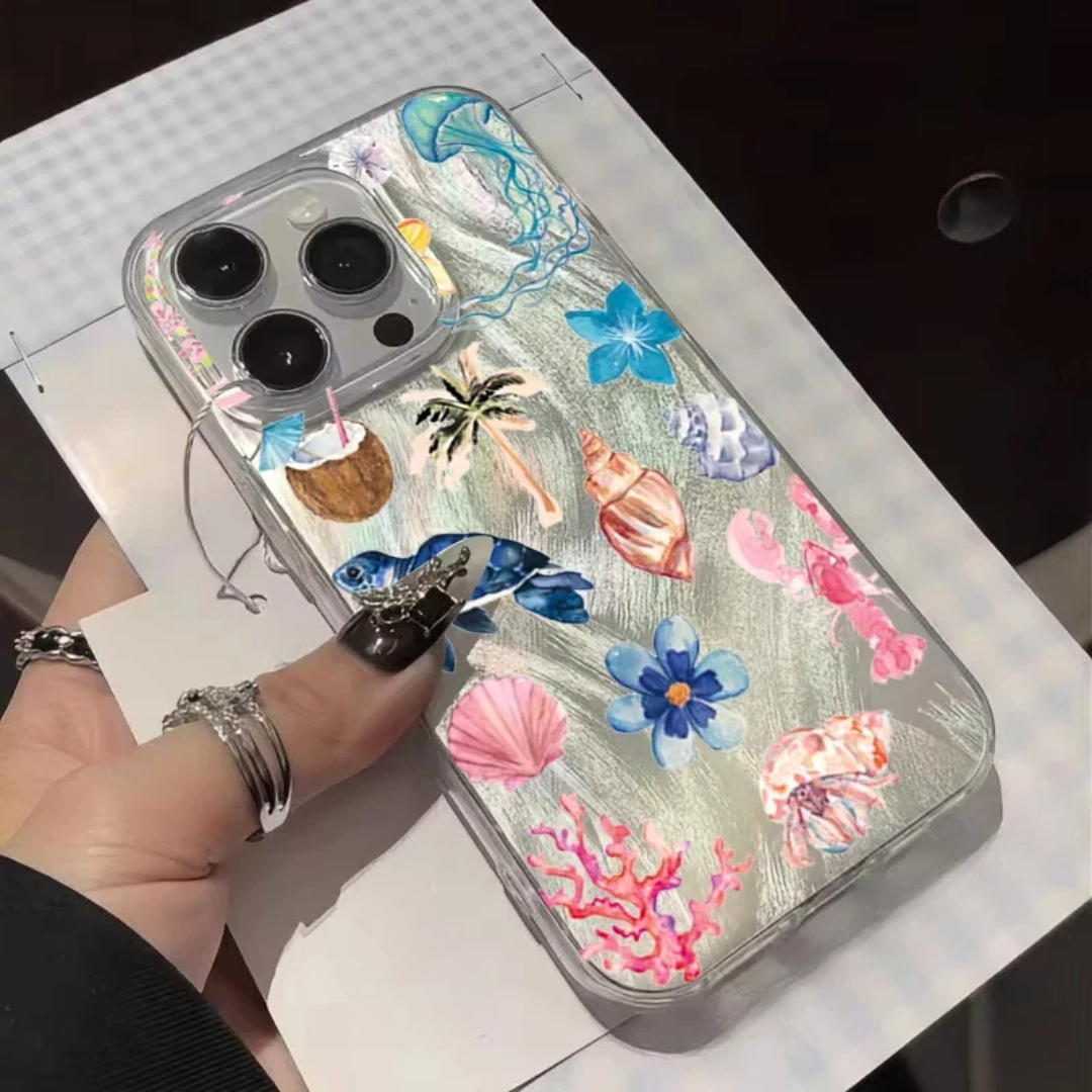 Shimmering seashells, playful whales, and coral motifs glisten on a crystalline backdrop, capturing a breezy summer romance in a slim, yet ultra-protective design. From dreamy getaways to everyday errands, it transforms your phone into a seaside statement piece.