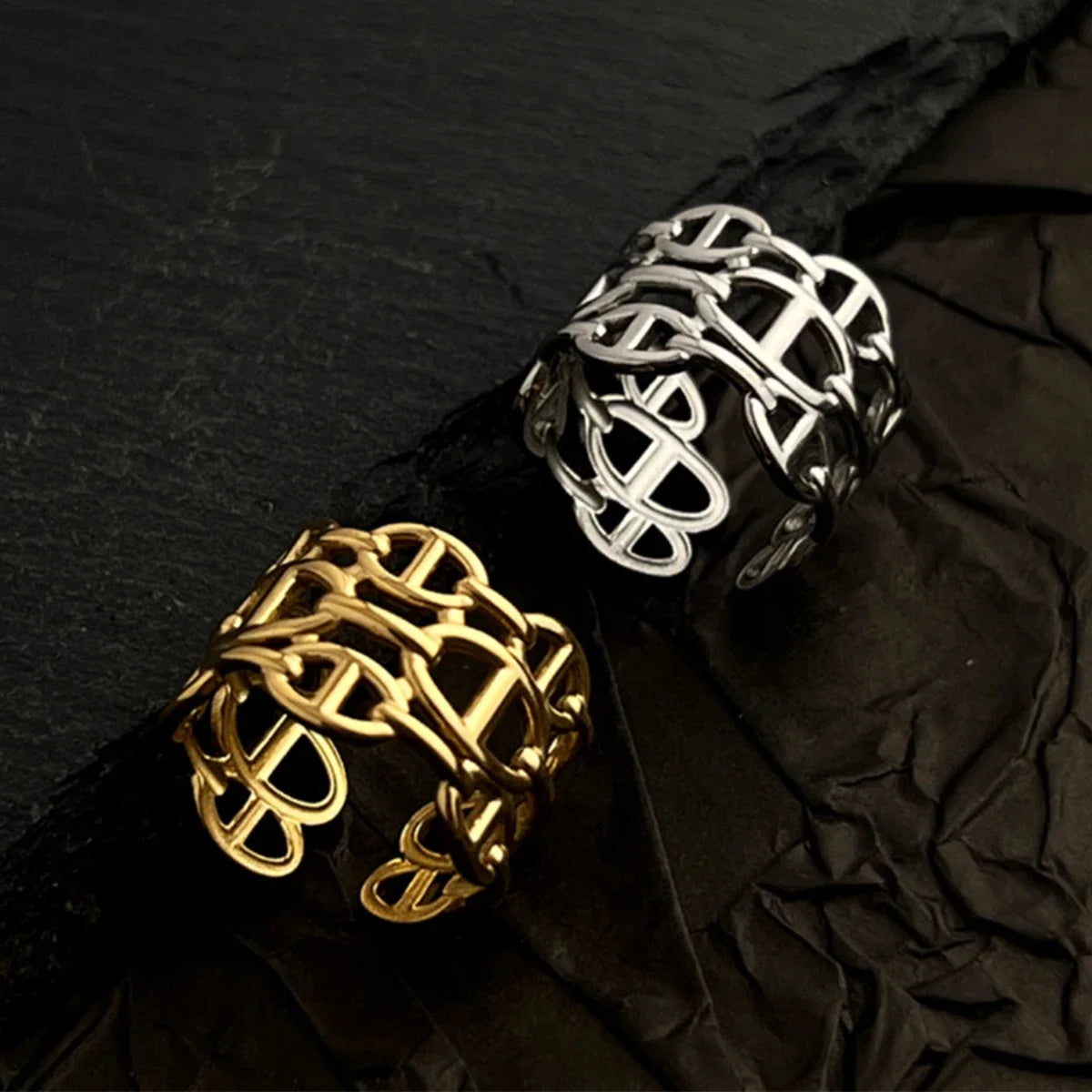 Its cage-like lattice wraps around your finger for an instant statement, while the adjustable open cuff ensures a comfortable fit. Rock it with streetwear or glam attire—this eye-catching piece refuses to go unnoticed.