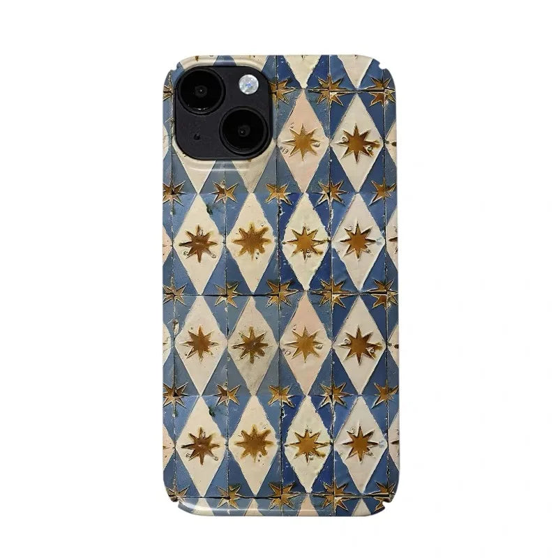 Vintage harlequin motifs meet celestial accents in a satin‑matte acrylic shell that feels tailored, not techy. Slim, protective, and photo‑friendly with a raised camera bezel, it slips cleanly into any pocket or mini bag.