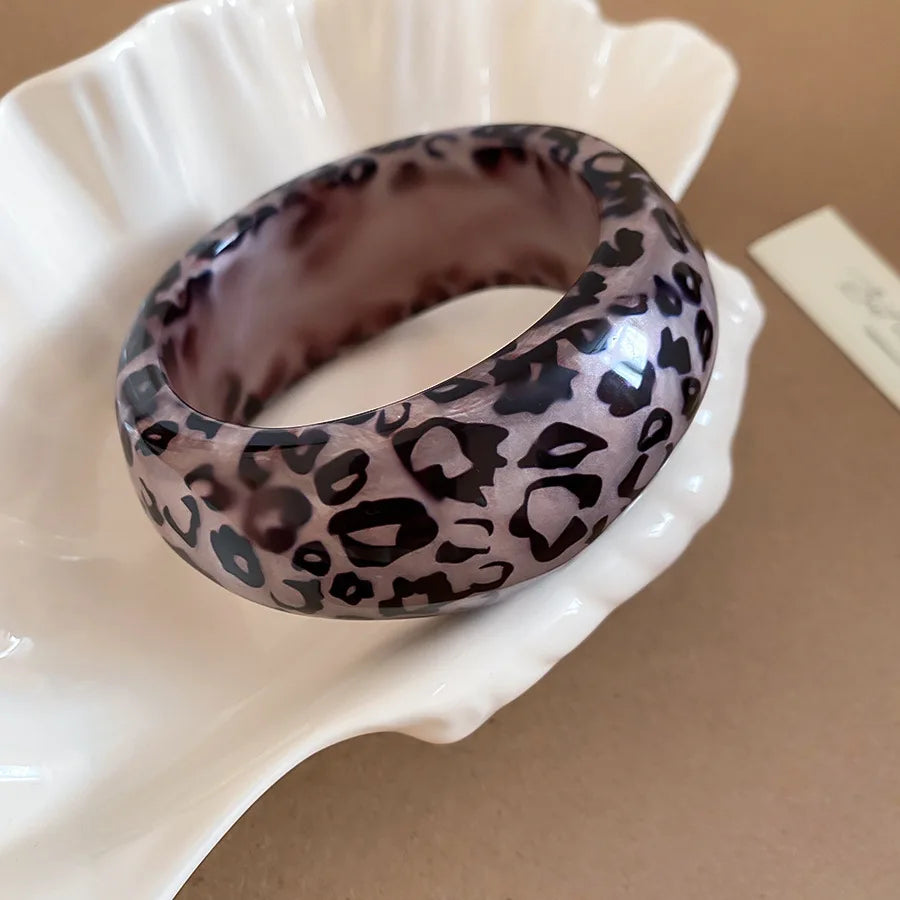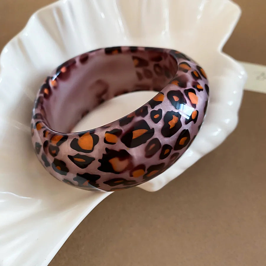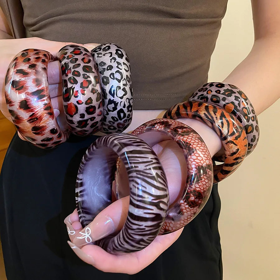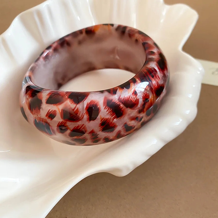 Wide resin bangles swirl leopard, snake, and geometric patterns into painterly, smoke-soft color—bold yet easy to style. Stack two or three for instant texture and a runway pop.