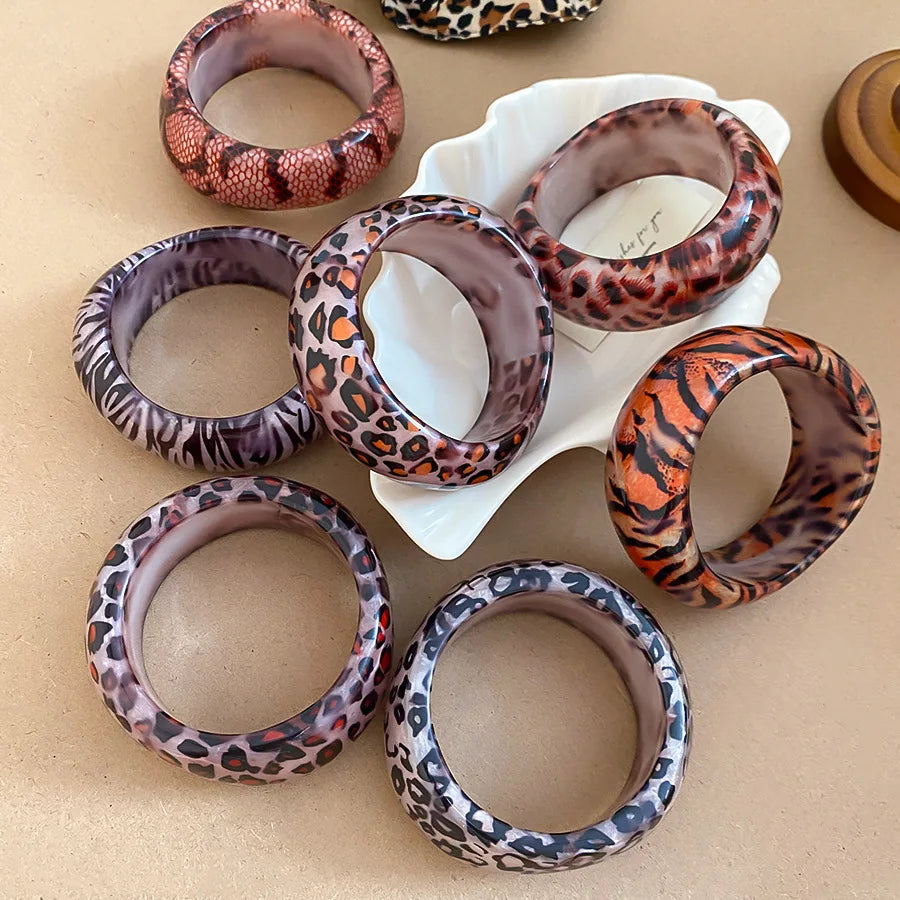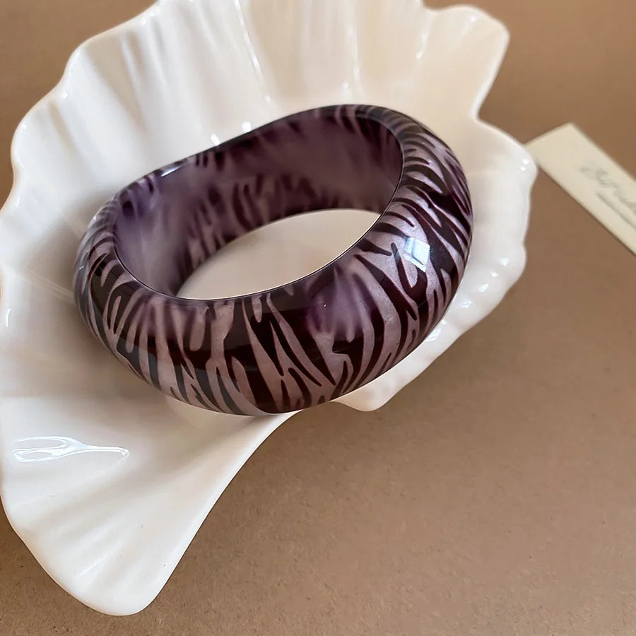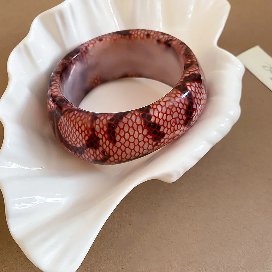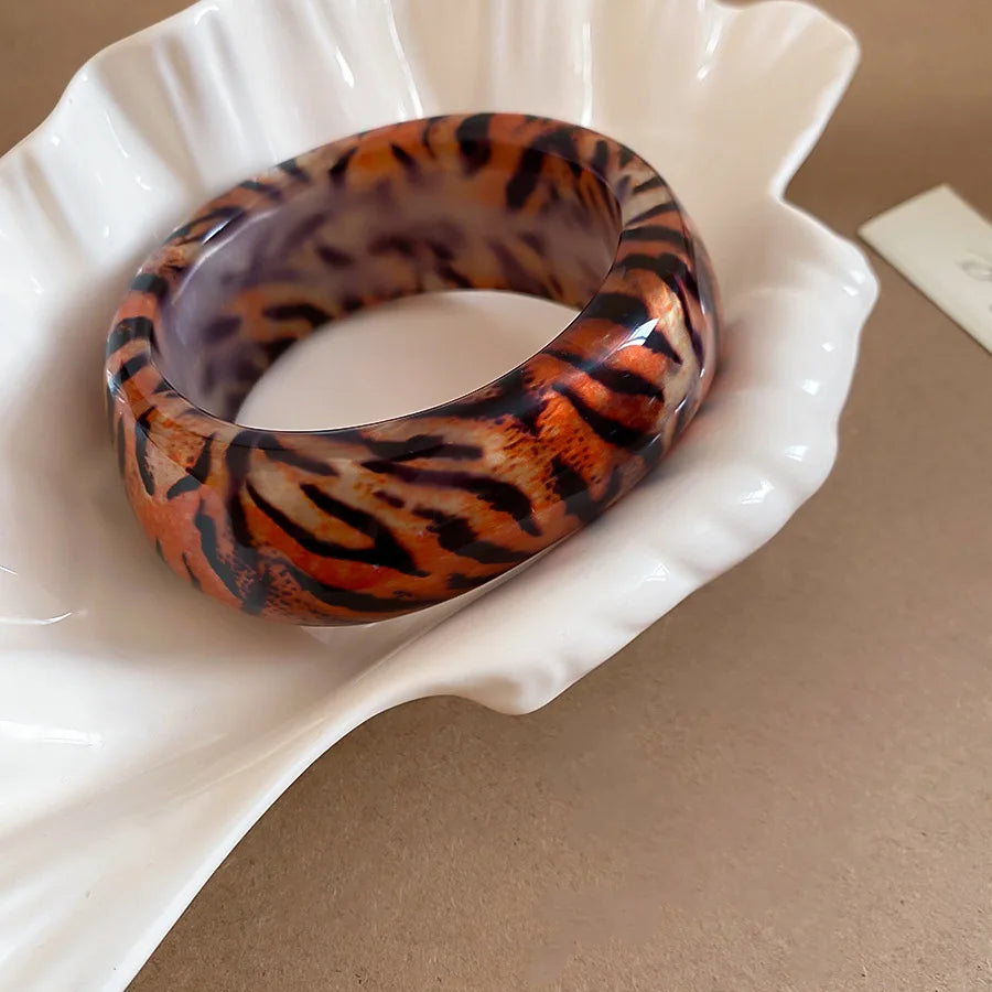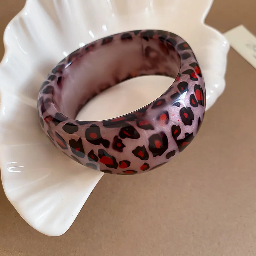 Wide resin bangles swirl leopard, snake, and geometric patterns into painterly, smoke-soft color—bold yet easy to style. Stack two or three for instant texture and a runway pop.