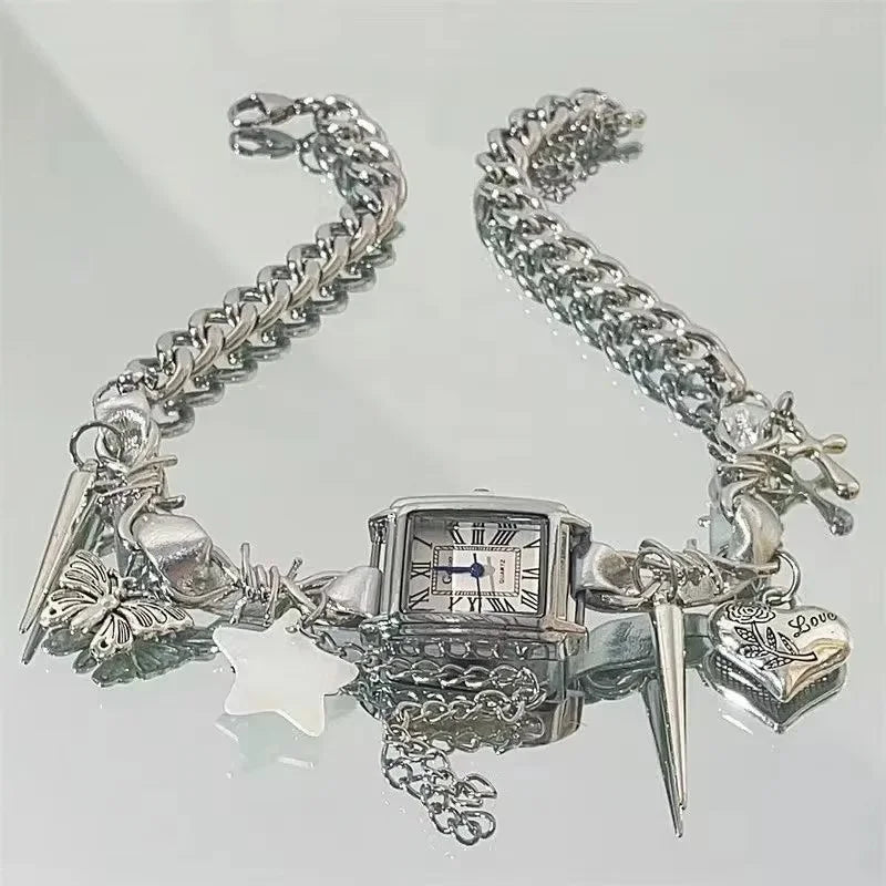 A sleek watch centerpiece anchors butterfly and star charms on a stainless steel chain, bridging Y2K nostalgia and cyberpunk mystique. Leather accents complete the look, ensuring every outfit radiates unapologetic boldness.