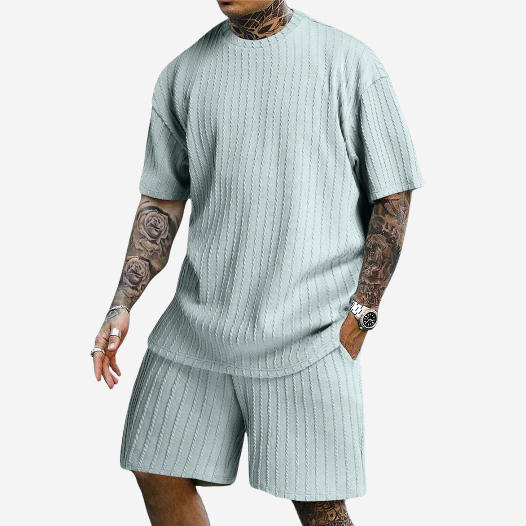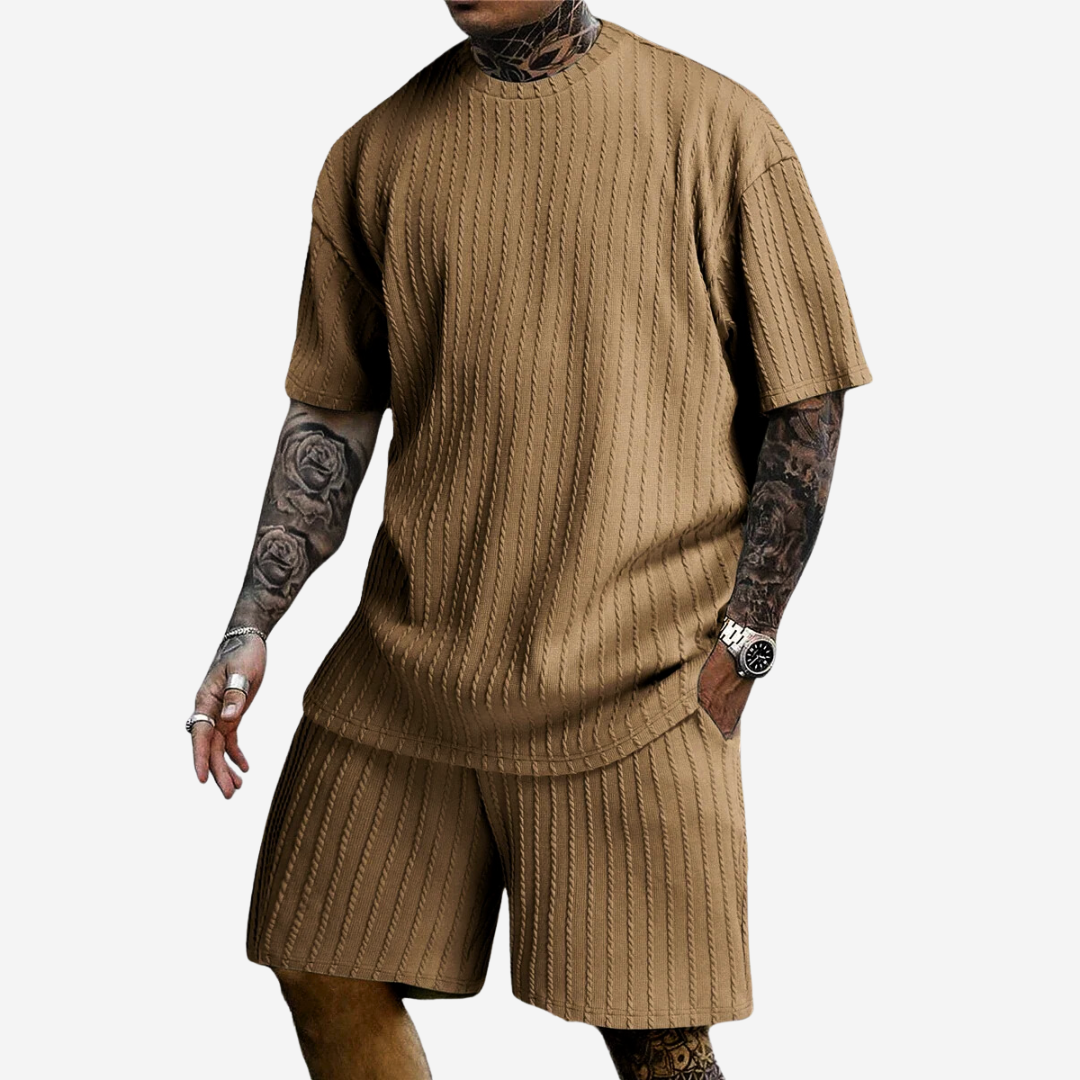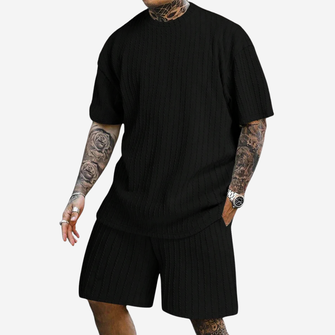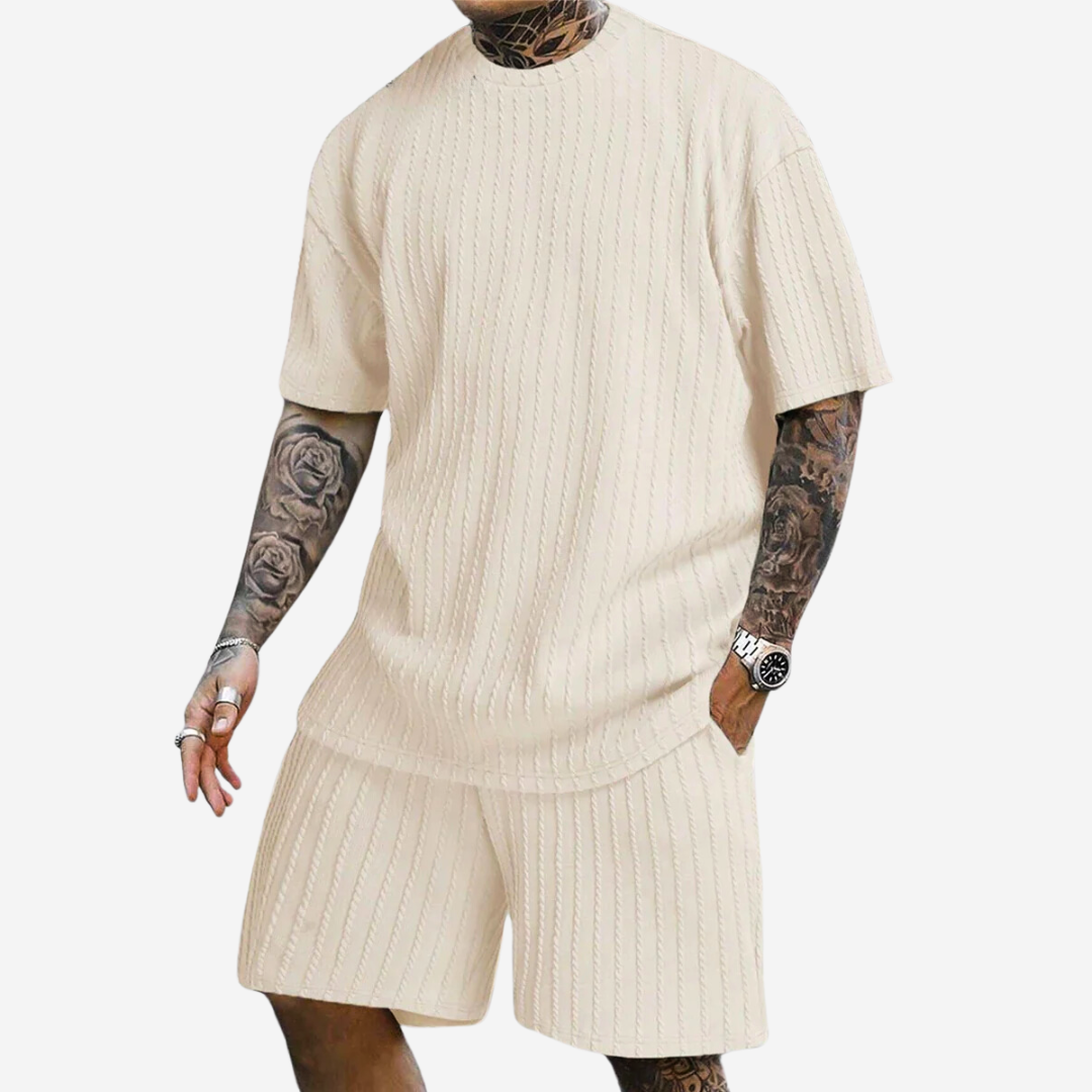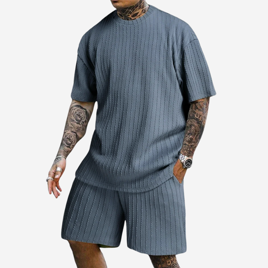 The relaxed fit T-shirt and shorts drape effortlessly, offering a laid-back yet refined aesthetic. Whether you're exploring the city streets, hitting the beach, or simply unwinding, The Atlas Ribbed Set is your passport to effortless style and comfort.