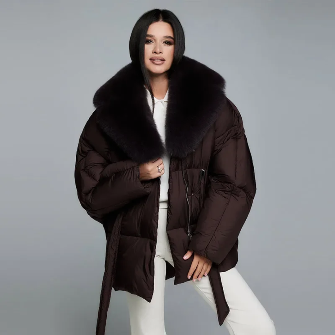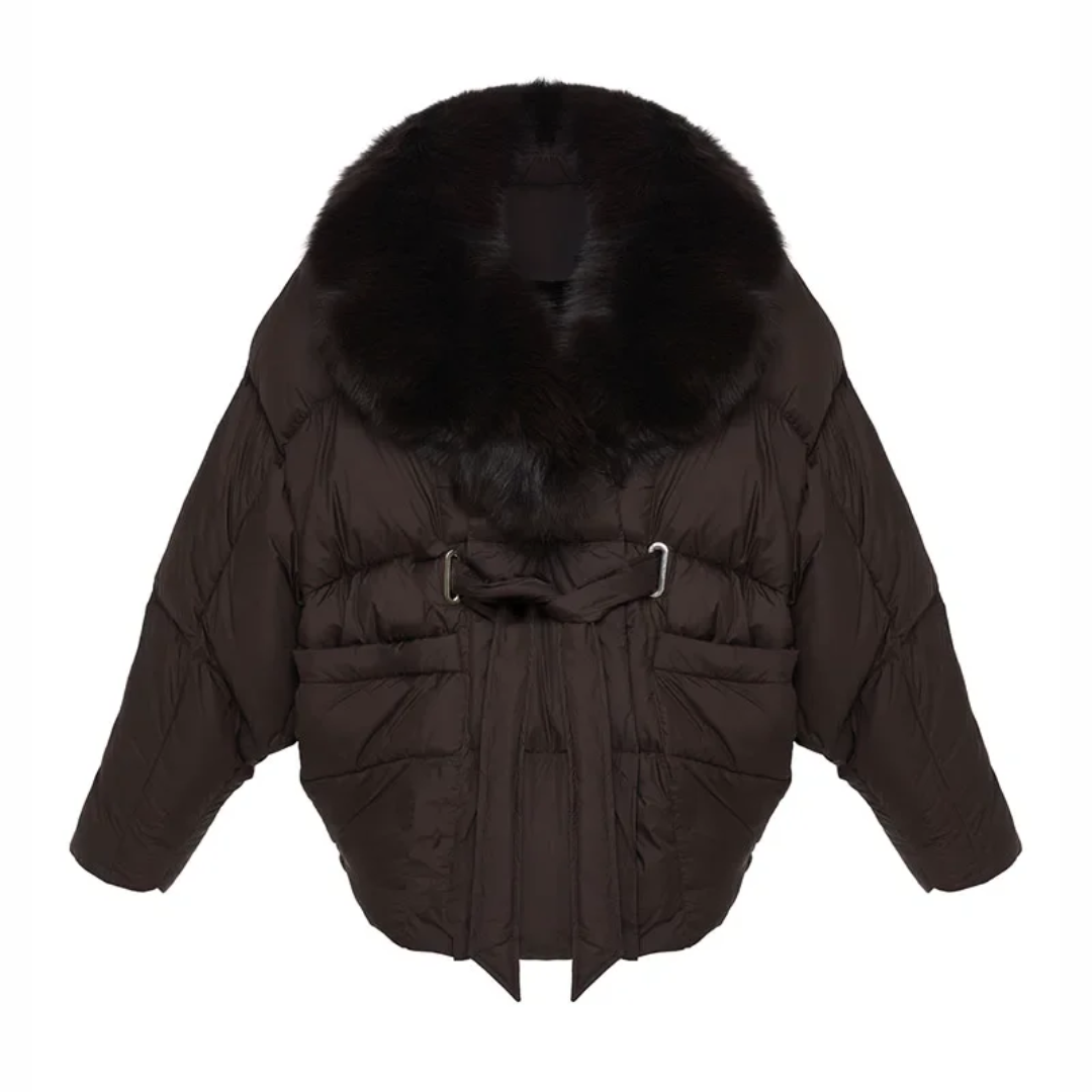 A rich chocolate-brown puffer is cinched at the waist with a soft tie belt, while an oversized faux-fur collar frames the face in plush, winter-editorial softness. The batwing sleeves fall into a relaxed drape, giving the coat a sculpted silhouette that looks expensive in mirror photos and street shots.