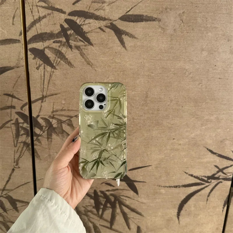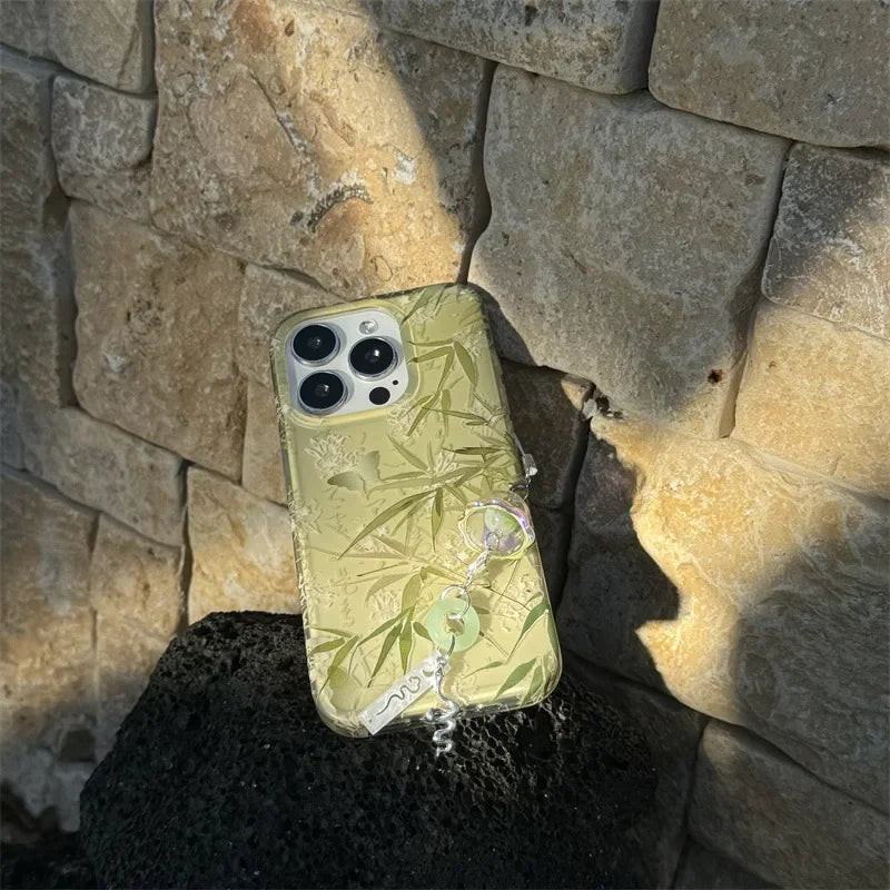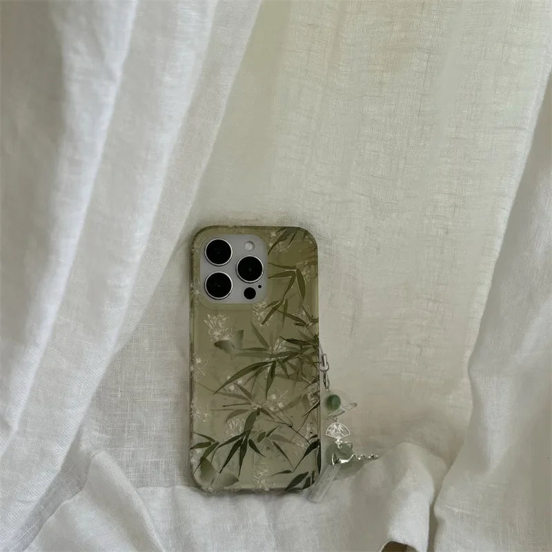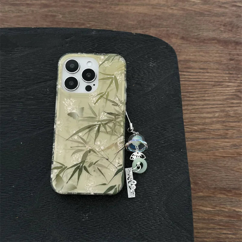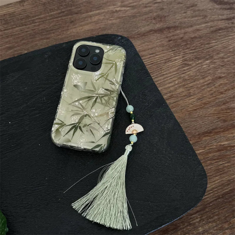 A silk‑clear shell hosts a hand‑inked bamboo grove that fades like mist across water, giving your phone a calm, art‑house glow. A miniature folding‑fan pendant, rimmed in warm metal, swings from a discreet anchor and pops off for wireless charging.