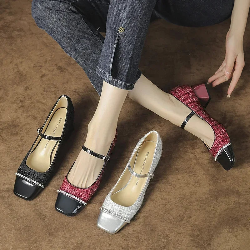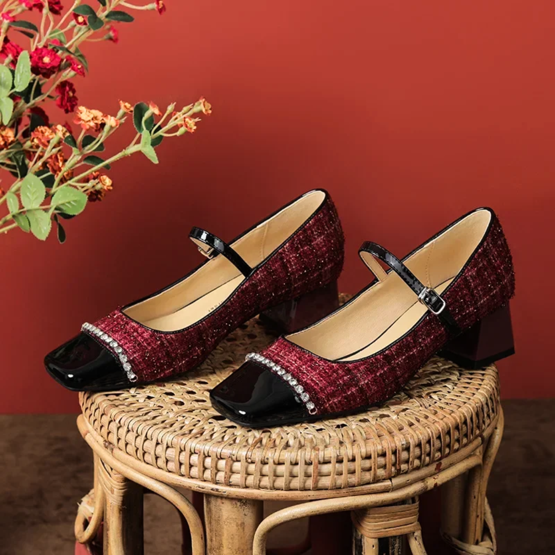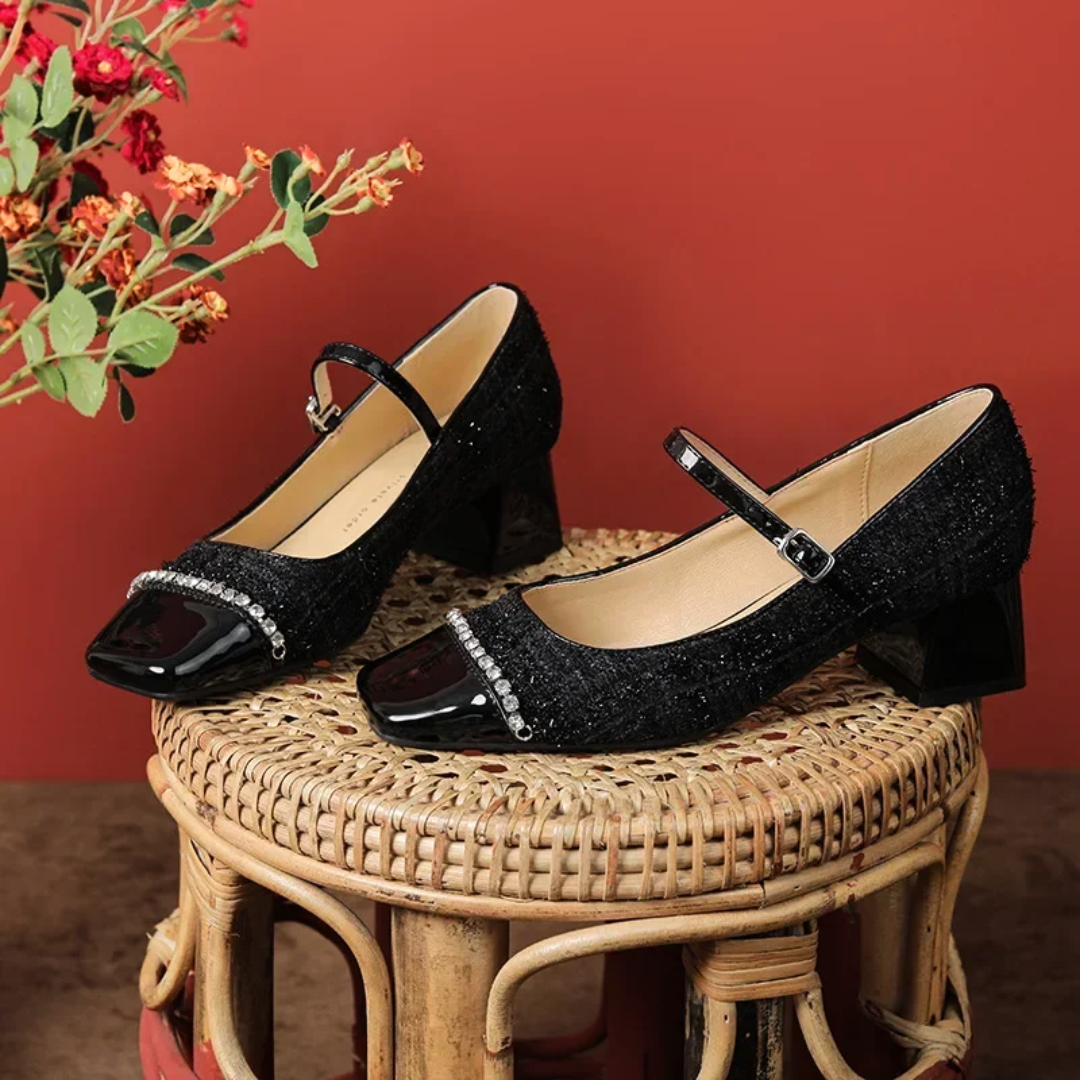 These shoes feature a durable faux leather upper with a padded insole for all-day comfort. The distinctive strap is adjustable with a brass buckle, allowing for a customized fit. A low 1.5-inch heel provides a subtle lift while maintaining stability.