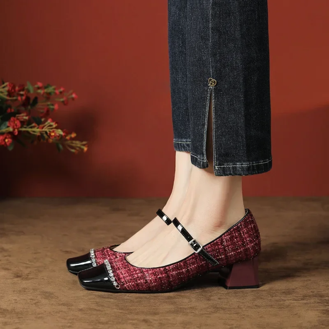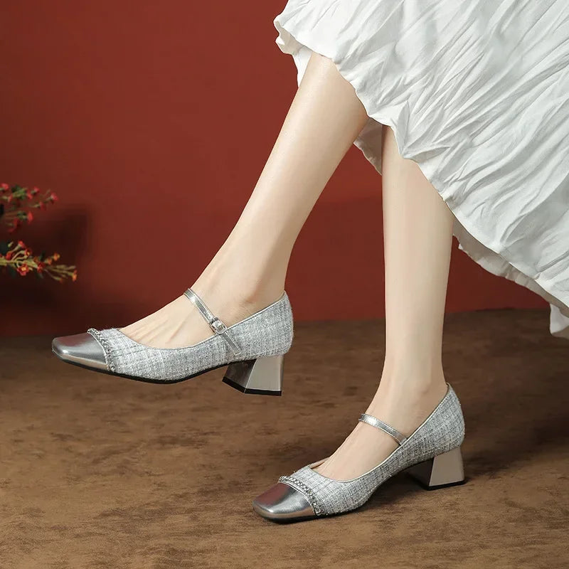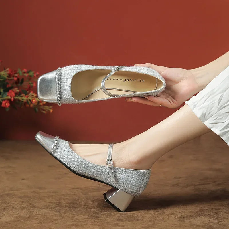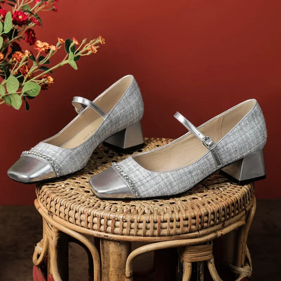 These shoes feature a durable faux leather upper with a padded insole for all-day comfort. The distinctive strap is adjustable with a brass buckle, allowing for a customized fit. A low 1.5-inch heel provides a subtle lift while maintaining stability.