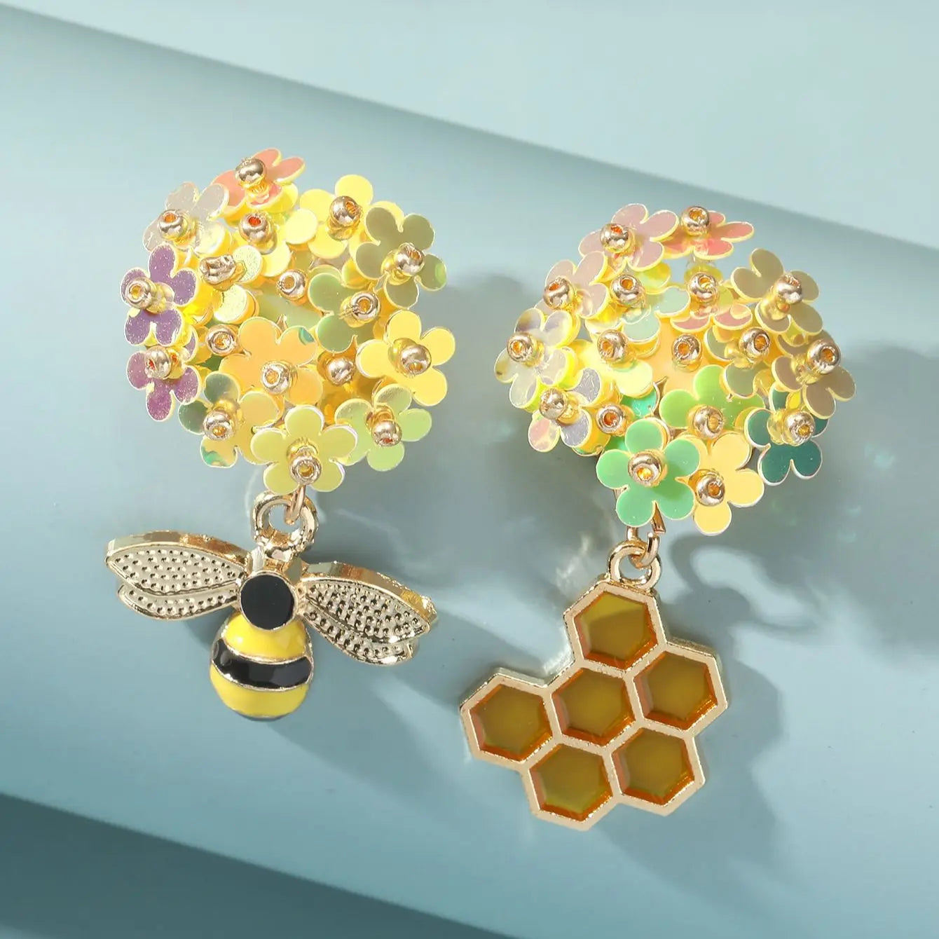 Each earring showcases a detailed bee figure with black and yellow enamel accents, perched atop a hexagonal honeycomb structure. The standout feature is the vibrant cluster of multicolored flowers that blossom above the bee, adding a cheerful and eye-catching touch.