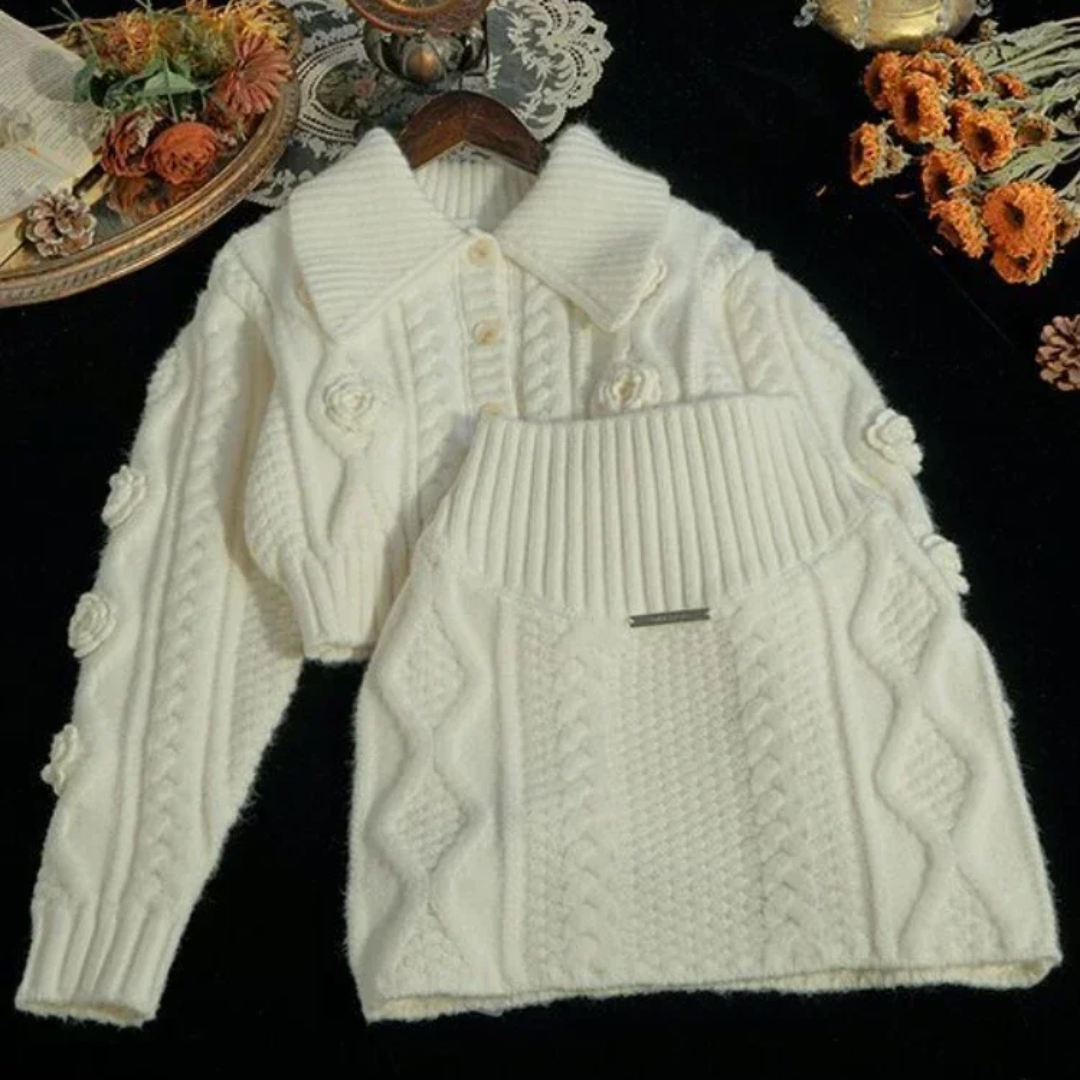 This ensemble is crafted from a luxurious knit, designed to keep you warm and stylish all season long. The detailed sweater features a flattering lapel collar and ribbed accents, while the coordinating skirt boasts a comfortable elastic waist and a graceful silhouette.