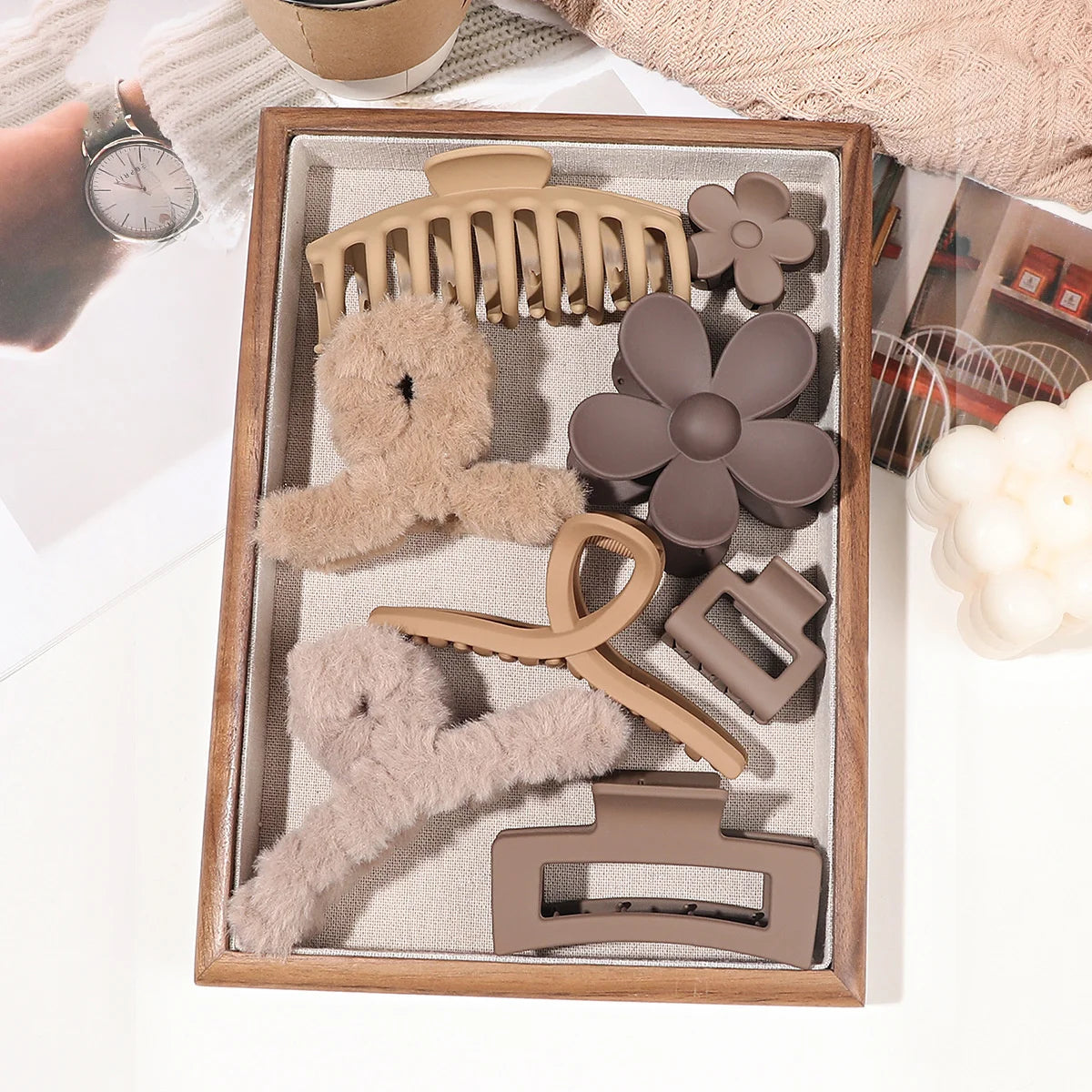 A curated collection of eight matte-finish hair clips, from plush floral accents to sleek geometric designs. Each piece offers a secure, no-slip grip, making it easy to elevate any hairstyle—whether you’re dressing up or keeping it casual.