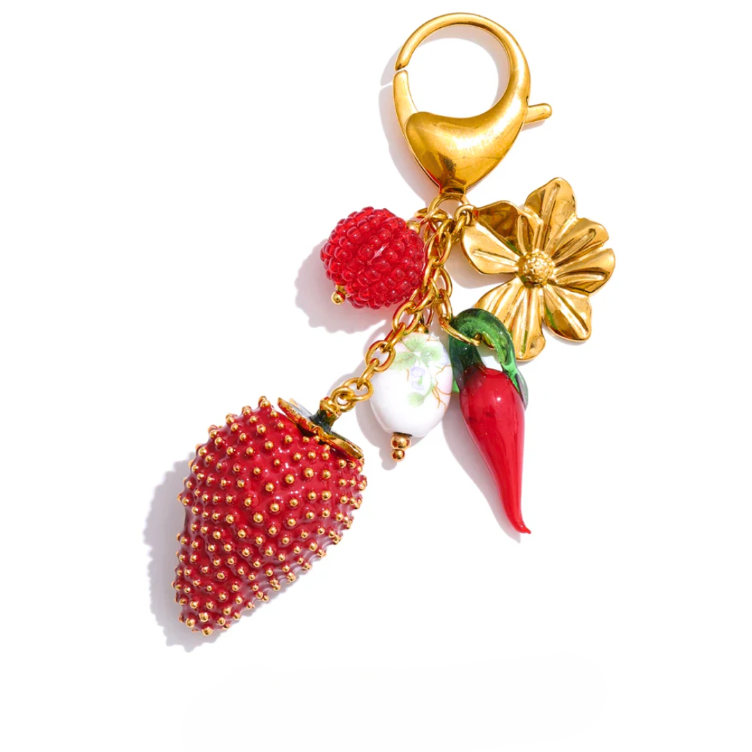 A textured seed‑bead strawberry swings beside a glossy red chili, porcelain blossom bead, and satin‑gold daisy—lighting up keys, bags, or zipper pulls with playful garden heat. The sturdy swivel lobster clasp snaps on in seconds for instant color and charm.