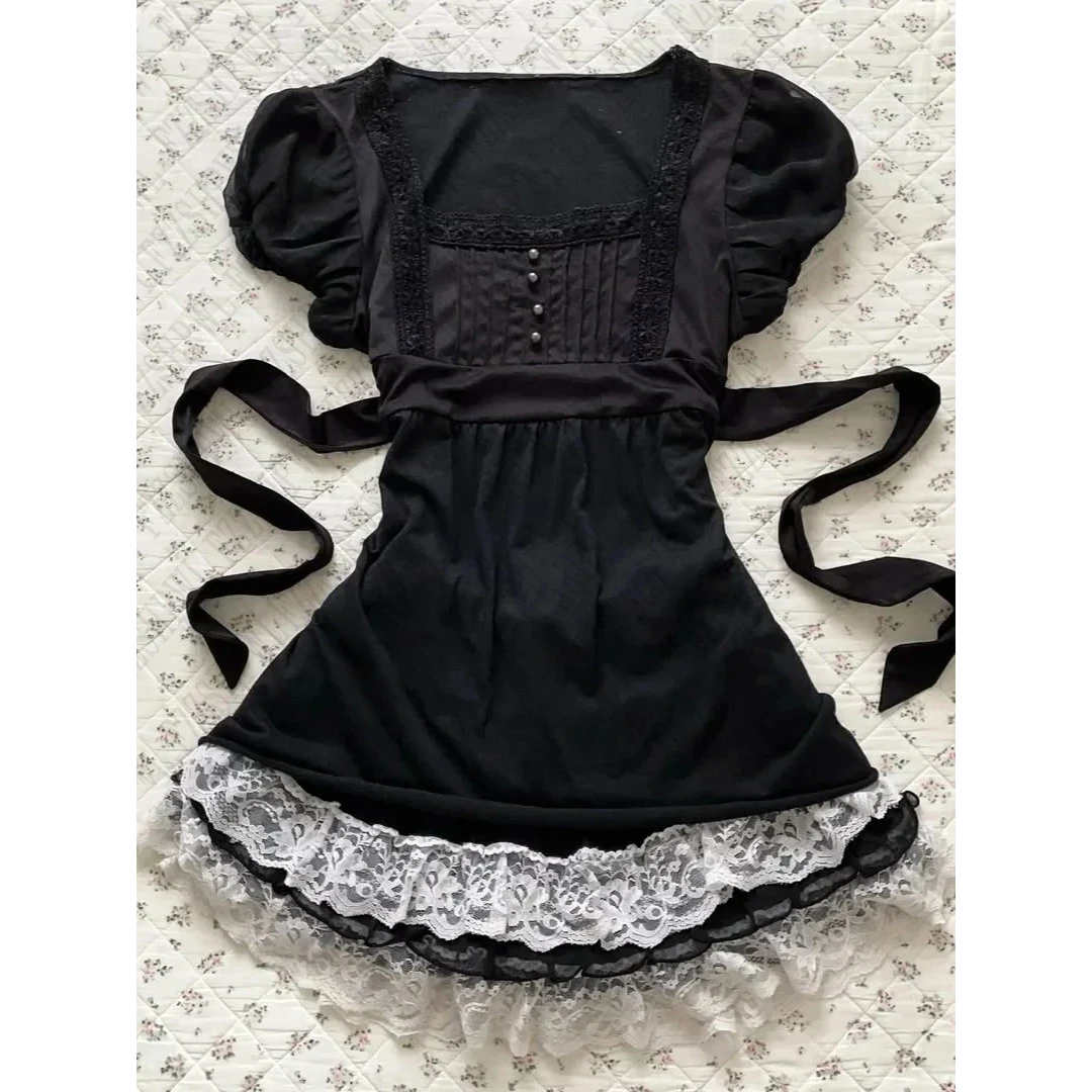 A structured black mini dress finished with lace trim and corset-style front detailing. Designed to shape the waist while keeping a soft, lightweight drape through the skirt.