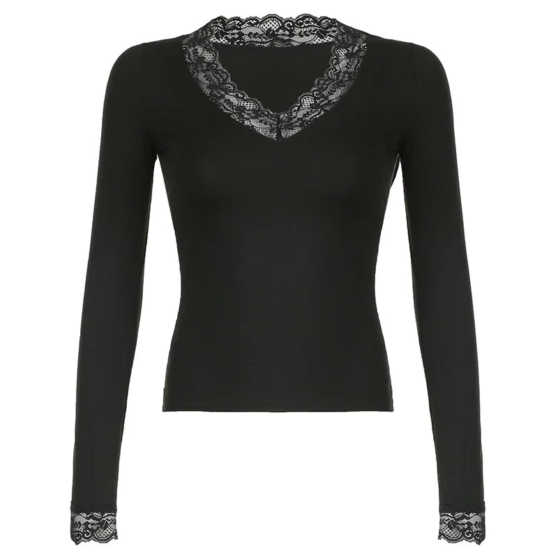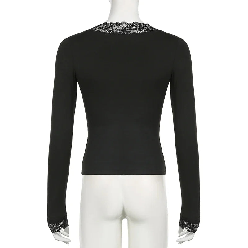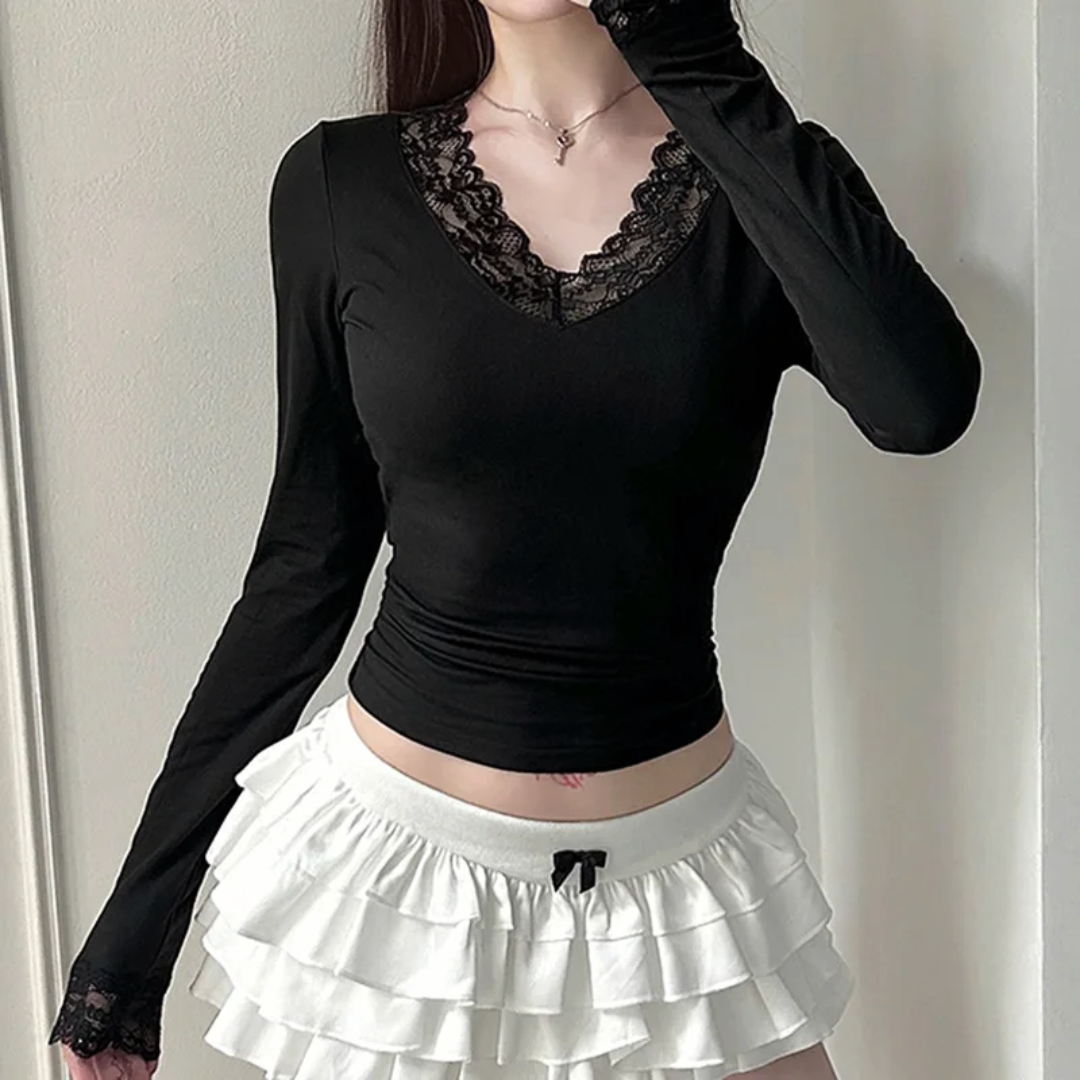 A fitted long-sleeve top finished with lace trim at the neckline and cuffs. Designed for styled outfits rather than everyday basics.