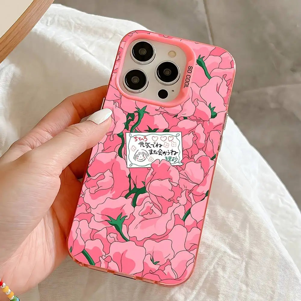 Choose candy‑pink botanicals or a scrapbook collage of notes, stamps, and inky starbursts—finished in soft satin‑matte for a luxe, velvety feel. A slim, rigid back keeps art crisp; a shock‑cushioned bumper shields edges, and raised bezels guard screen and camera.