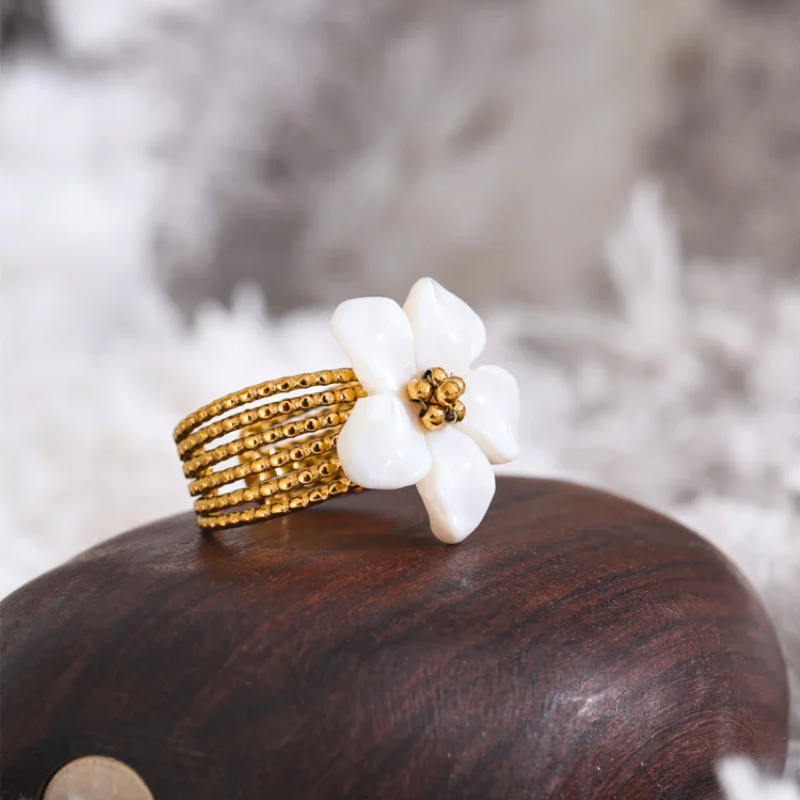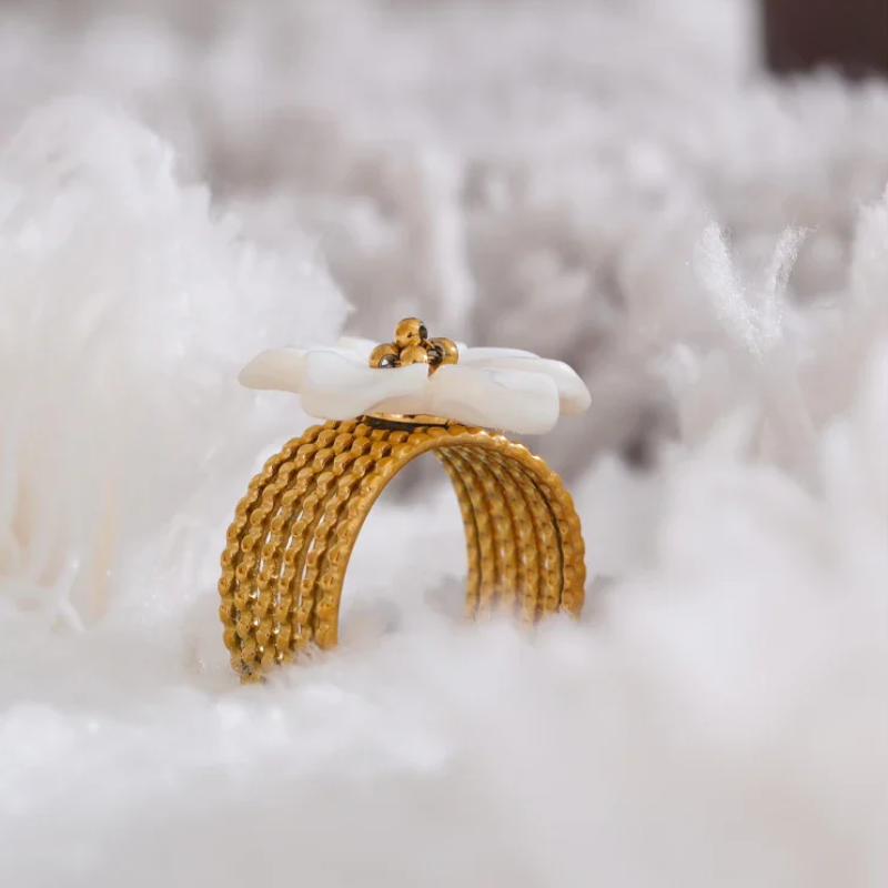 A delicate white flower, frozen in a moment of perpetual bloom, nestled atop a band that twirls like a golden vine. It's as if Mother Nature herself decided to become a master jeweler for a day!