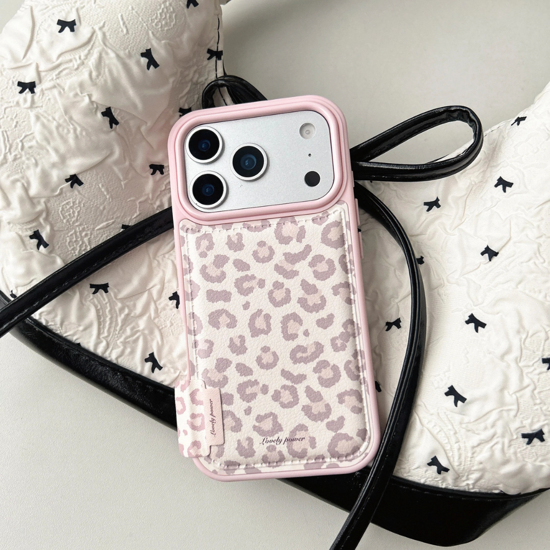 A muted pink backdrop is covered in soft, velvety leopard spots, giving the case a subtle glam look that feels both cute and polished. The smooth shock absorbing shell wraps around the edges while the pale blush frame makes your camera look extra bright in photos.