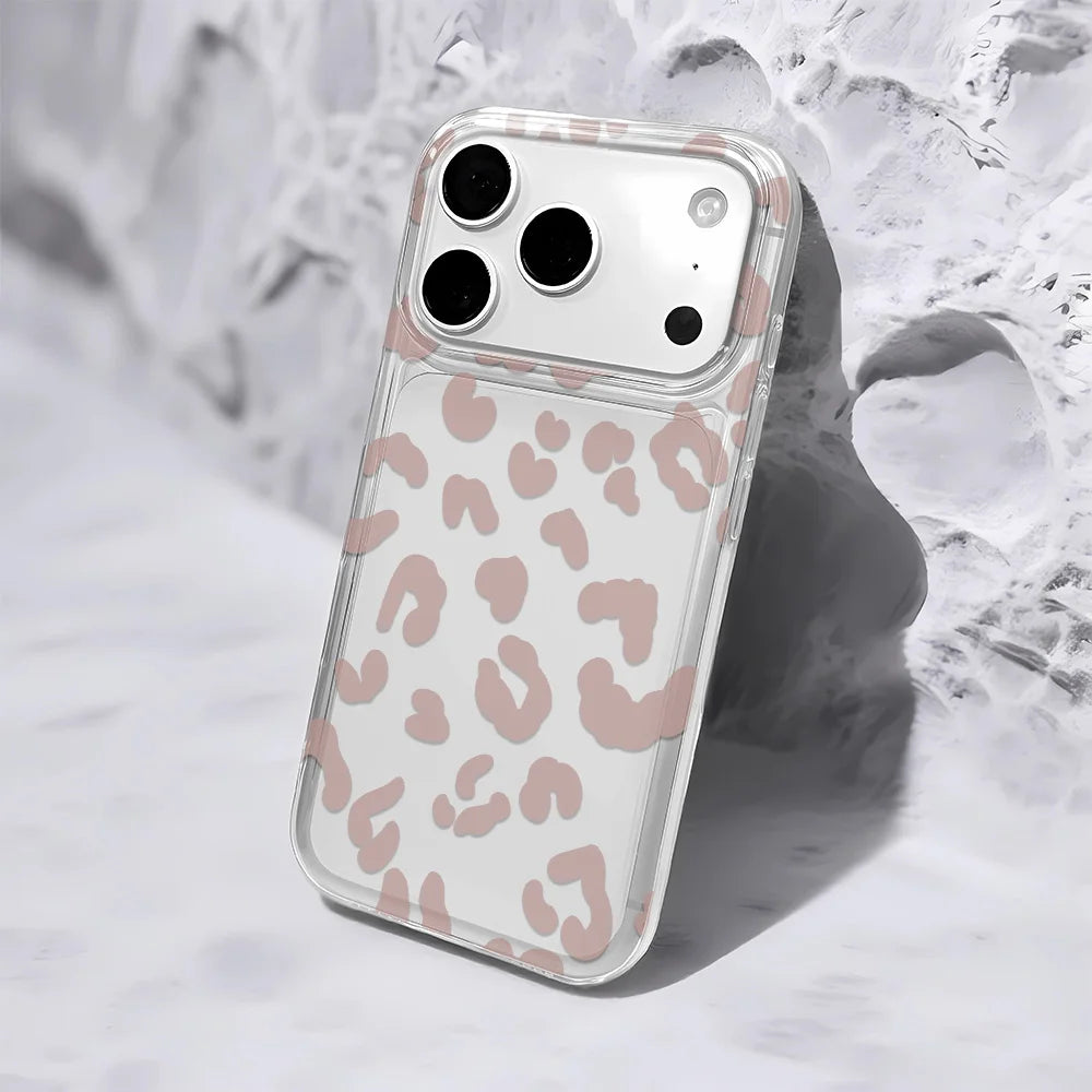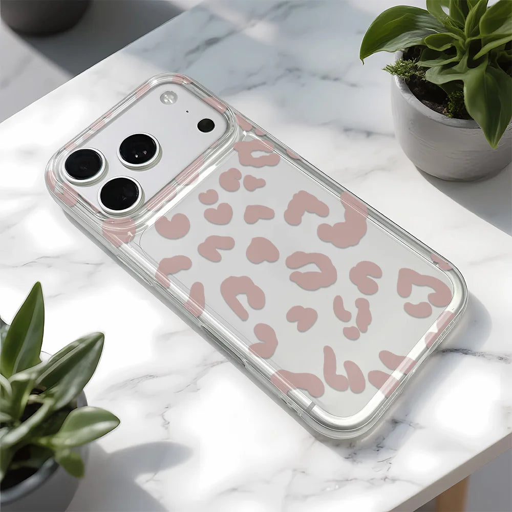 A softened leopard pattern settles over a muted rose foundation, less wild statement and more studied instinct. The palette is restrained, allowing the print to feel composed rather than loud. Encased in a reinforced frame, Blush Sauvage delivers everyday protection while preserving its tonal subtlety and clean profile.