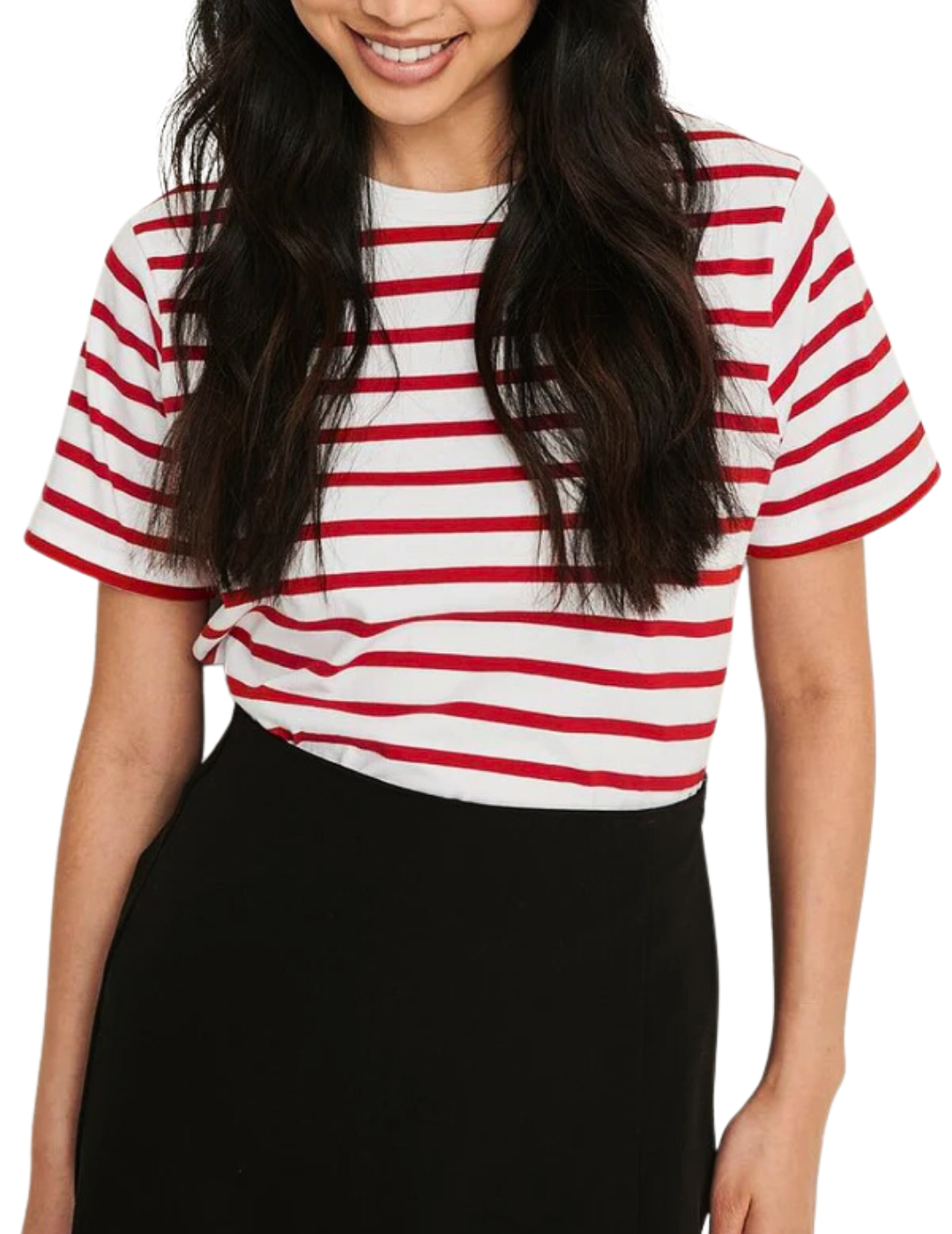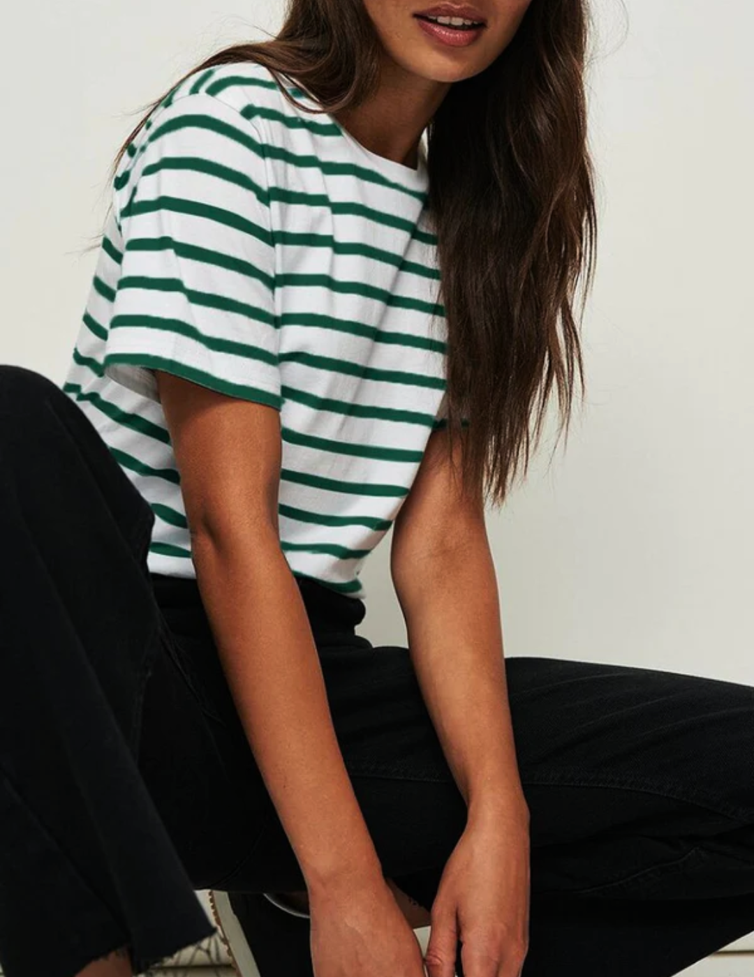 Introducing the Olivia Brown Classic Stripe Essential Tee, a timeless and versatile striped tee perfect for any wardrobe. Experience ultimate comfort and effortless style with its flattering round neckline, short sleeves, and soft, breathable fabric.