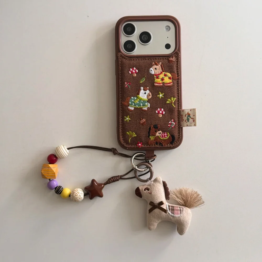 Brown phone case with embroidered pony and flower patches on a textured surface. Full back coverage with camera cutouts.