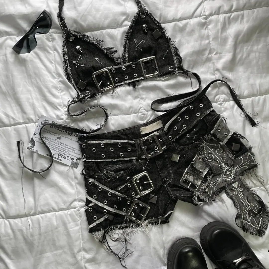 Intricate geometric embroidery collides with patchworked black denim, crafting a daring two-piece that fuses Harajuku edge and gothic allure. From its structured zip-up jacket to the pleated mini skirt, every detail roars with a rebellious Y2K spirit ready to rule both day and night.