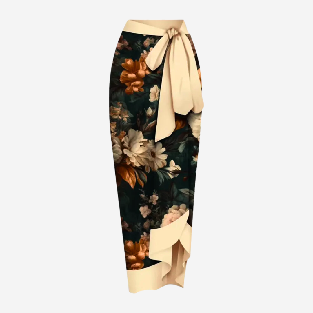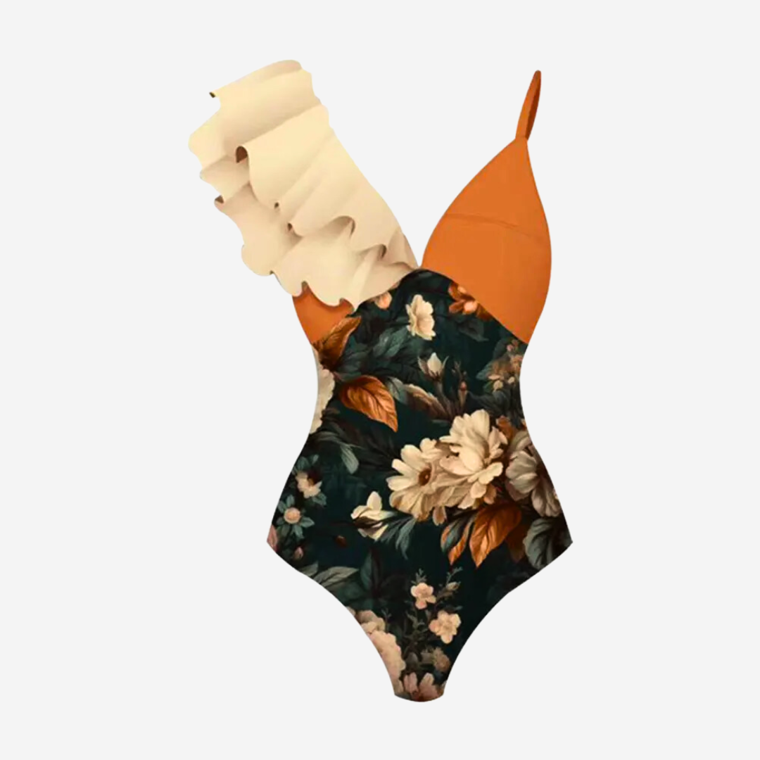 This enchanting one-piece swimsuit is designed to make a splash, featuring a playful floral print, alluring deep V-neckline, and flirty ruffle accents. The bright orange straps and trim add a pop of color, while the matching sarong offers effortless style and coverage for a seamless transition from beach to bar.