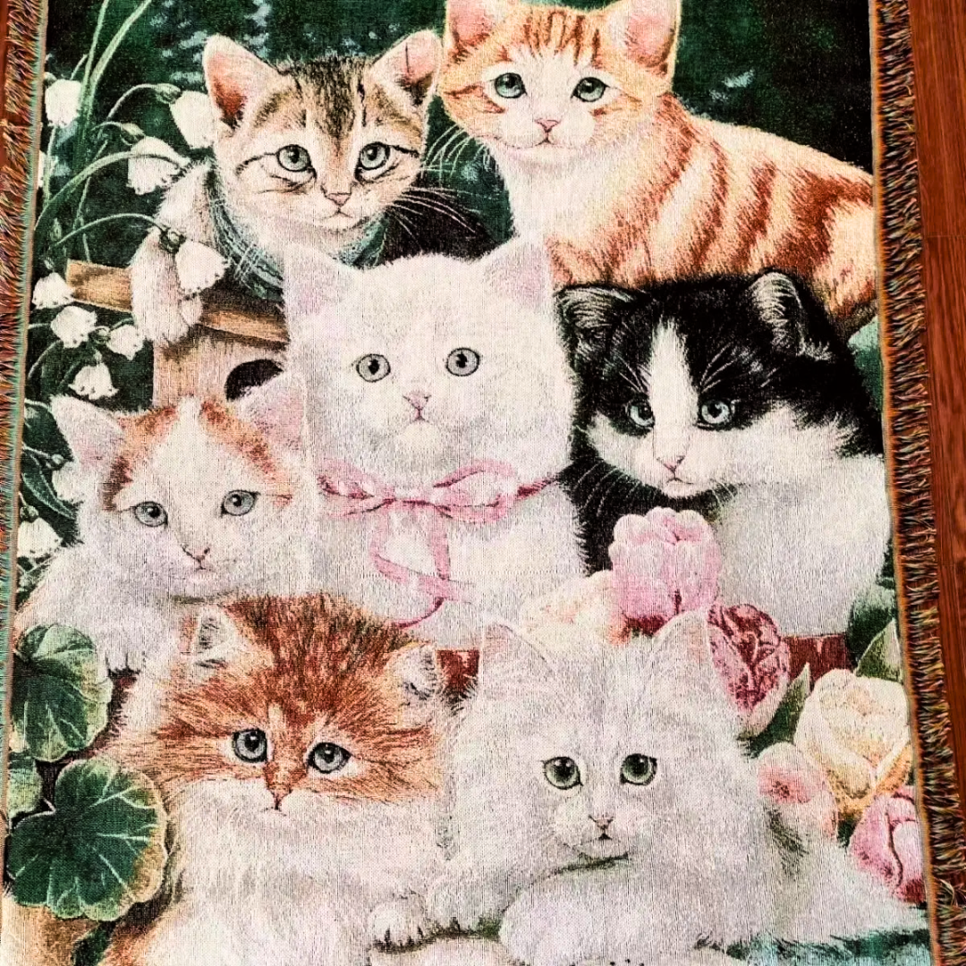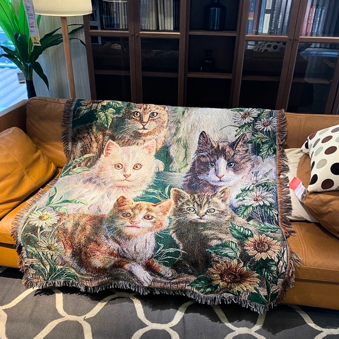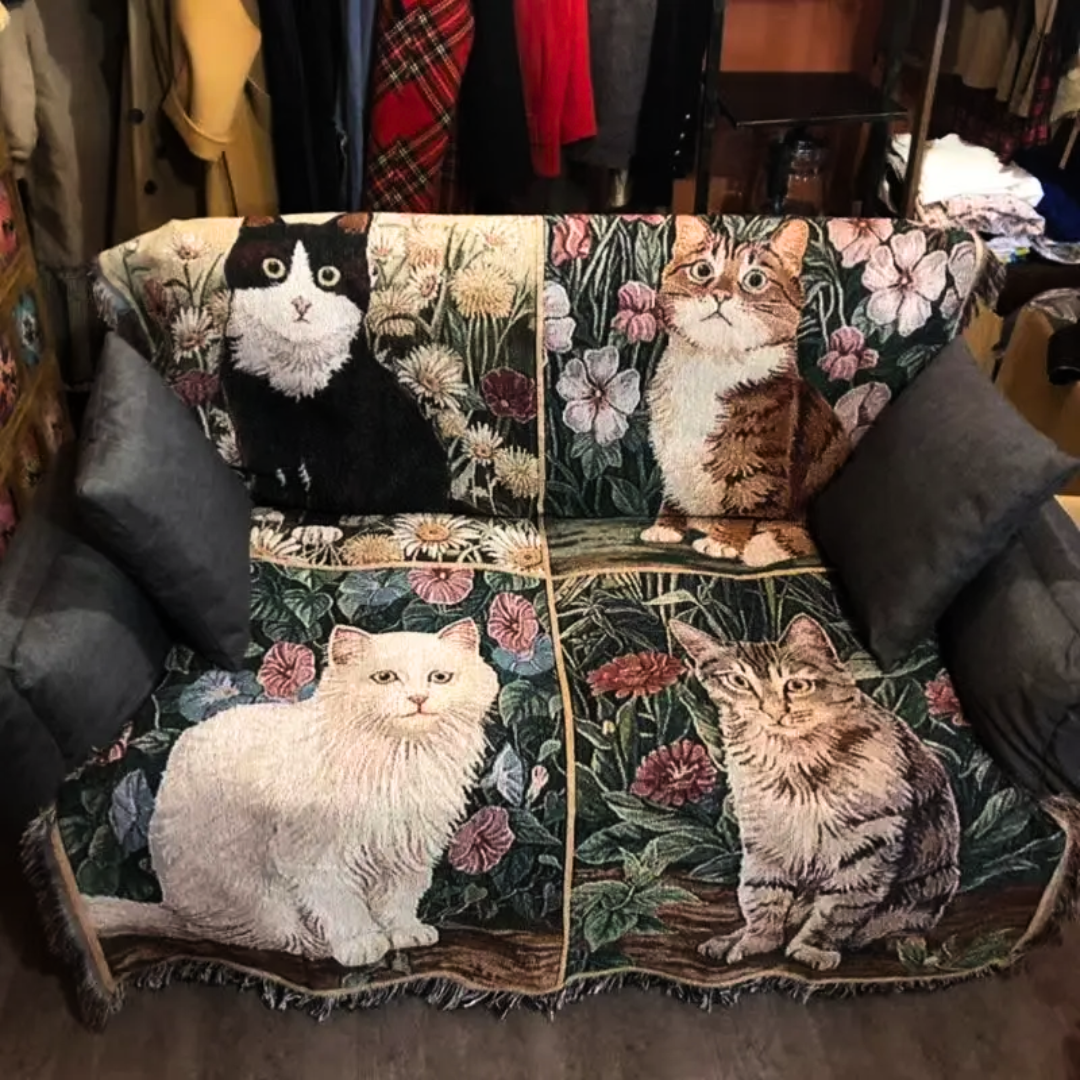 Our Cat Nap in the Secret Garden tapestry throw blanket is a purr-fect portal to a whimsical world where playful kittens prance through blooming meadows and sun-drenched nooks.