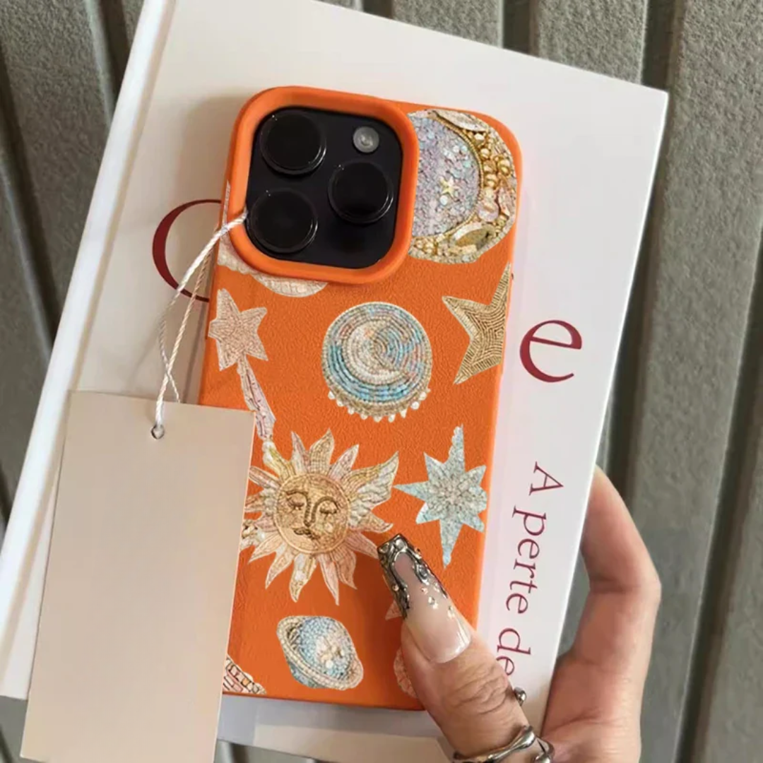 Sun, star, and zodiac-inspired emblems arranged across a textured field. Graphic yet composed, built on a reinforced shell that preserves clarity and structure.