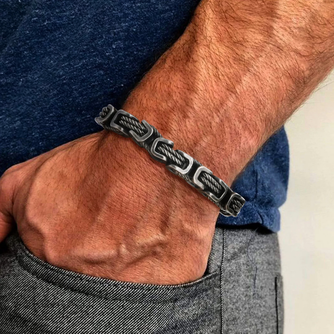 This bold, Byzantine-inspired bracelet is forged from durable stainless steel with a retro grey finish, giving it a vintage vibe that's both rugged and refined. Perfect for the modern warrior who appreciates timeless design and uncompromising quality.