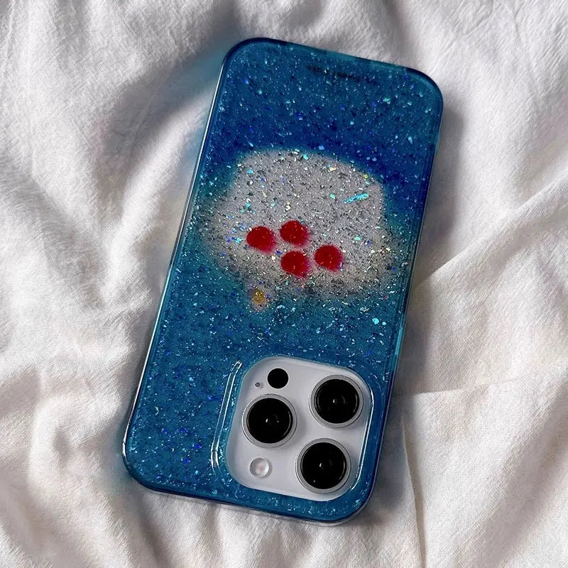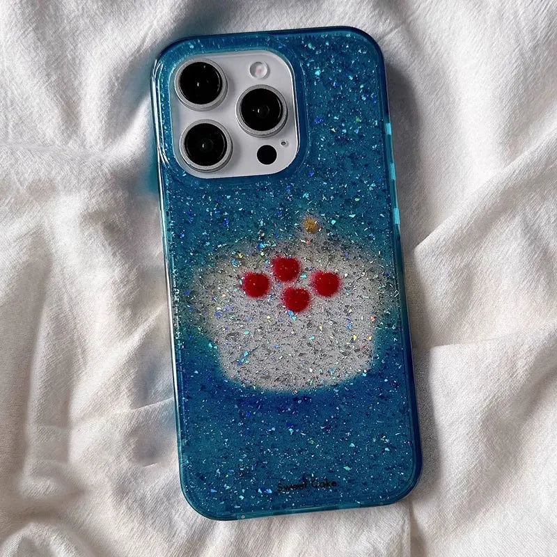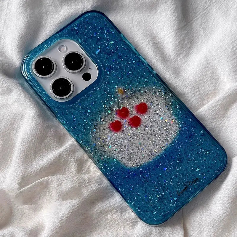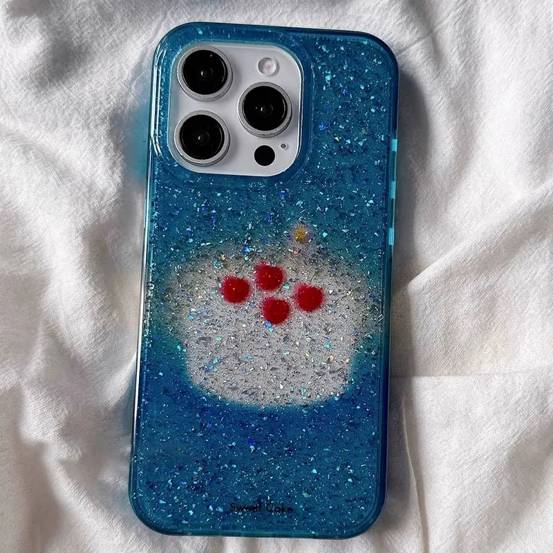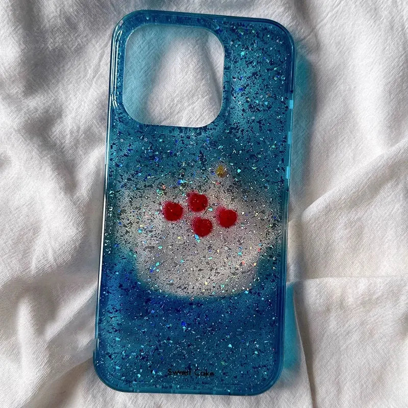 A sparkly blue backdrop with a cute cherry cake design. It’s slim, protective, and fits multiple iPhone models for a fun Y2K vibe.