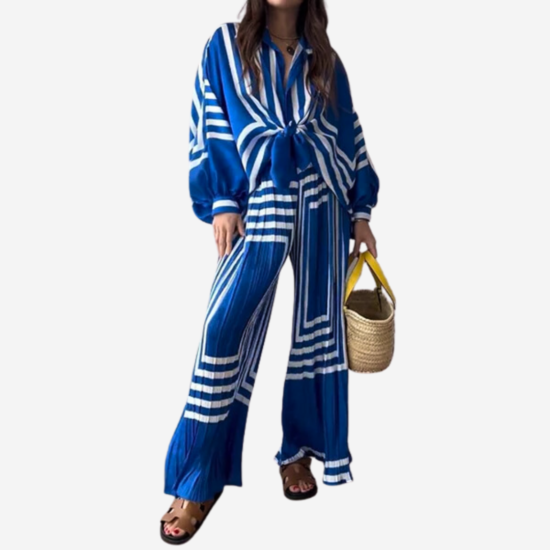 Introducing the Ava Kensington Azure Elegance Set, a stunning and sophisticated women's top and bottom set featuring a blue striped design. Crafted from high-quality polyester, this ensemble ensures a lightweight and wrinkle-resistant wear, perfect for any occasion.