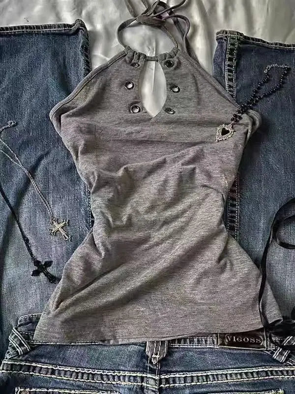 Smoke‑grey, razor‑sleek, and pure Y2K attitude. This tie‑neck halter carves a clean silhouette with a teardrop keyhole framed by chrome eyelets—equal parts punk and pretty. Longline cut skims the waist for that low‑rise‑jeans moment, while the open back ties let you cinch it exactly how you want.