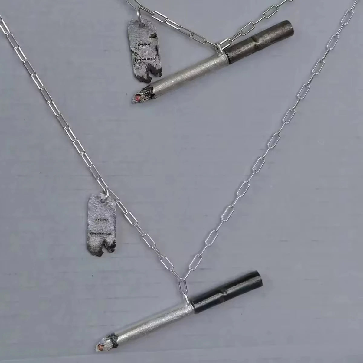 A metal cigarette bar pendant designed for stark, minimalist shock value. Clean, provocative, and intentionally blunt — this piece is about attitude, not subtlety.