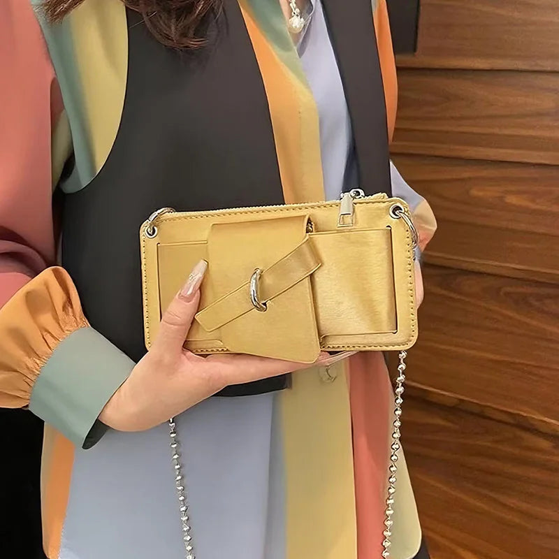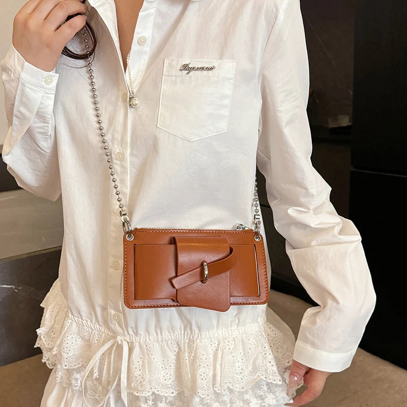 Sleek, phone‑first, and finished with a polished bead chain. The sculpted leather body holds just what you need—zip top, hidden card slot, and a clean silhouette that elevates every outfit.