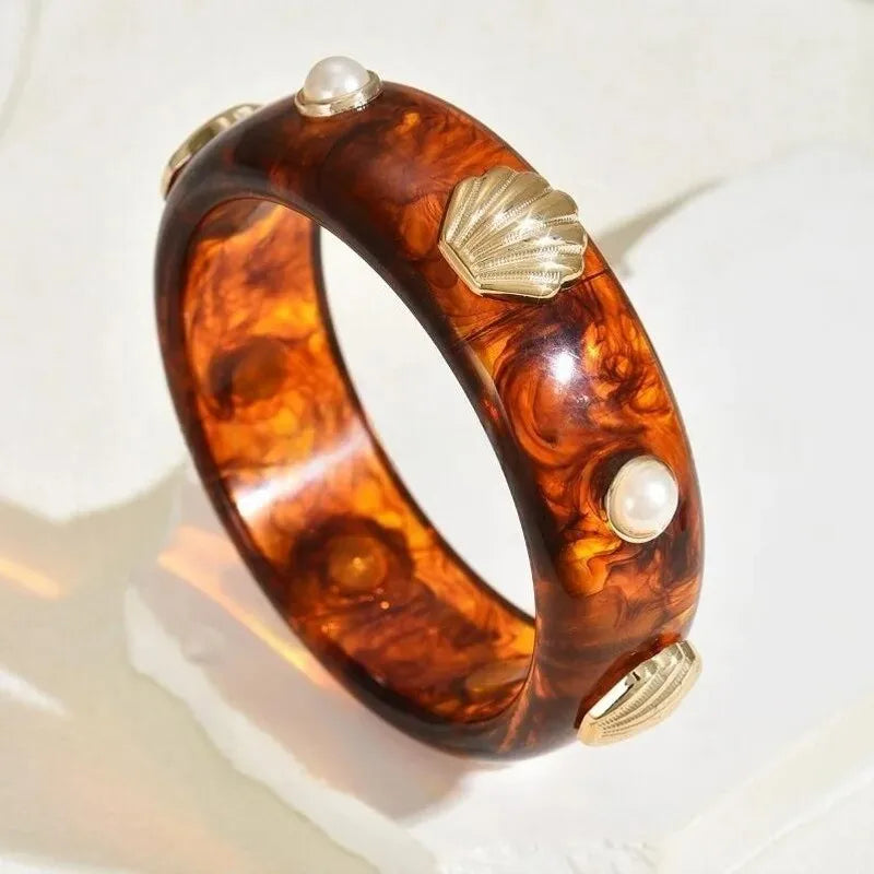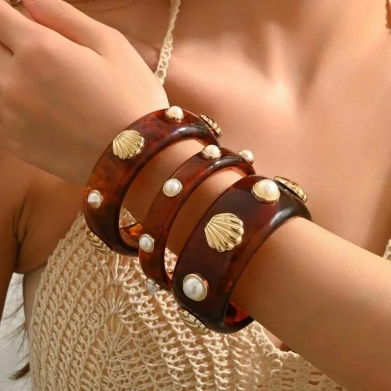 Hand‑cast in glossy tortoiseshell or moon‑sand resin, this wide cuff is inlaid with miniature cowrie cameos and lustrous seed pearls—an heirloom echo of seaside summers gone by. Wear one or stack three; their waterproof finish means the glow stays immaculate from salt spray to candlelight.