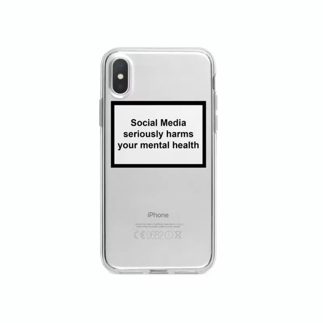 A stark black-on-white warning graphic sits on a clean transparent shell, giving the phone an editorial street-style edge. The minimalist type treatment contrasts sharply against the clear frame, making the message stand out in mirror selfies and casual shots.